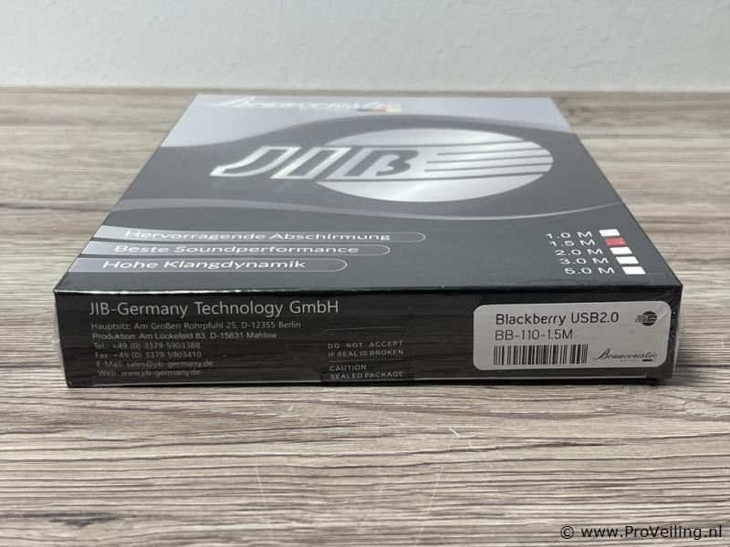 USB-kabel: merk JIB Boaacoustic; type Blackberry USB 2.0 BB-110-1.5M; nieuw in verpakking; winkelverkoopprijs ca. € 55,-.