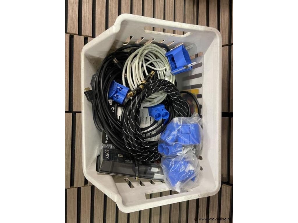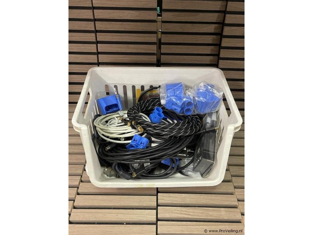 Partij diverse (audio) kabels in krat