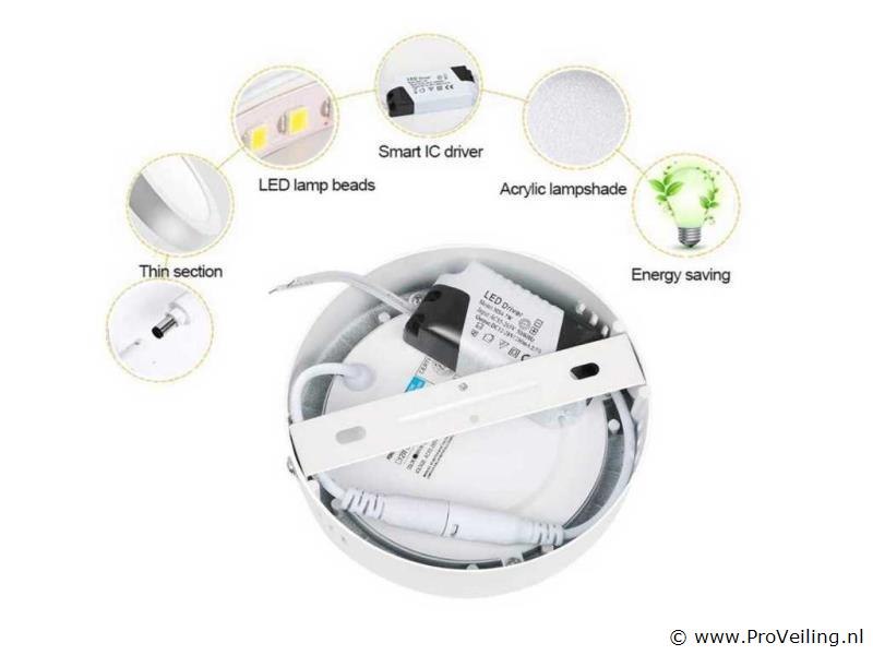 10 x Rond LED-paneel op Oppervlakte – Vermogen: 12W – LED-type: SMD – Kleurtemperatuur: 6500K (koud wit) – Lichtstroom: 960 lumen – Afmetingen: 160 x 28 mm – Spanning: 220-240V (50/60 Hz) – IP20 – Levensduur: 30.000 uur – Beamhoek: 40° – Driver en montageset inbegrepen – Geschikt voor gebruik binnenshuis, ideaal voor kantoren, winkels, gangen en keukens.