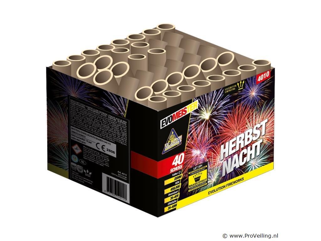 Herbstnacht, Maak u klaar voor een spectaculaire lichtshow! 40 schoten lang knalt deze absolute topper van een siercake de mooiste rode/gouden effecten de hemel in, om af te sluiten met een prachtige crackling burst!
