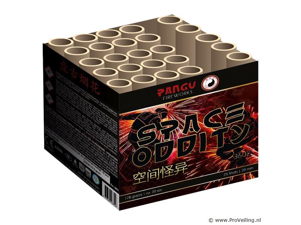 Space Oddity, 25 shots 20mm cake. Deze siercake uit de Pangu Fireworks collectie schiet heldere blinkers, gekleurde parels en een knetterende crackling finale salvo.