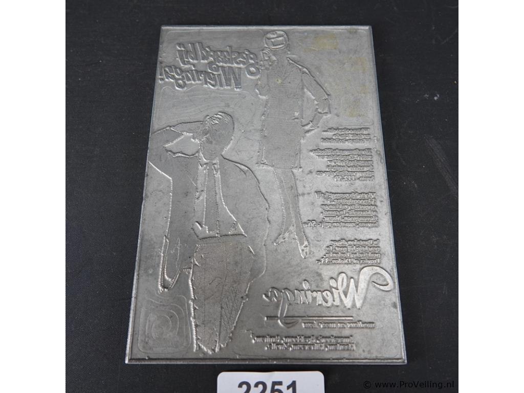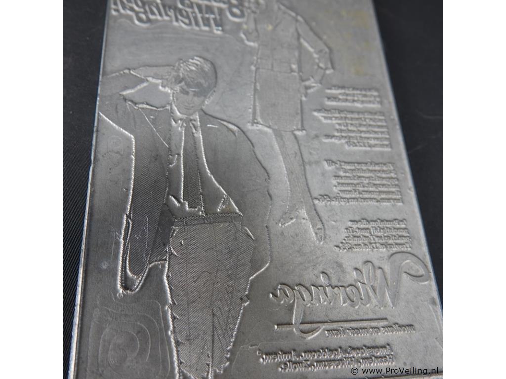 Drukplaat voor hoogdruk (letterpress) met afbeeldingen van een man en een vrouw, en tekst in spiegelbeeld. H18cm/B12cm/110Gr. Lees a.u.b. ook de extra veilinginformatie voor deze veiling!.