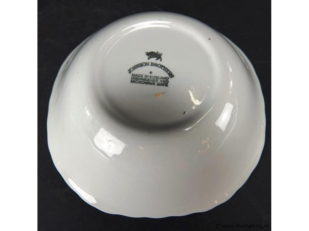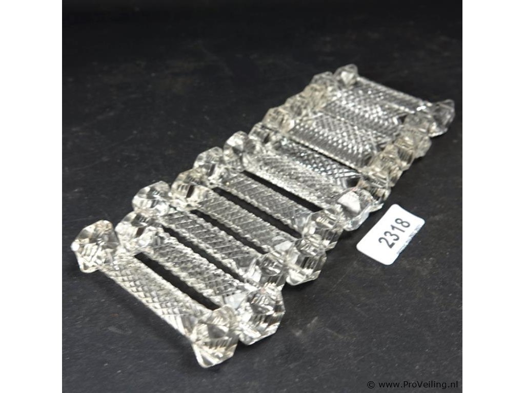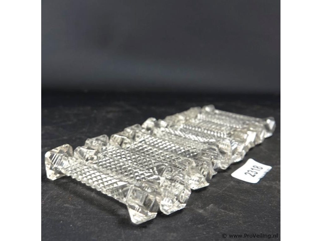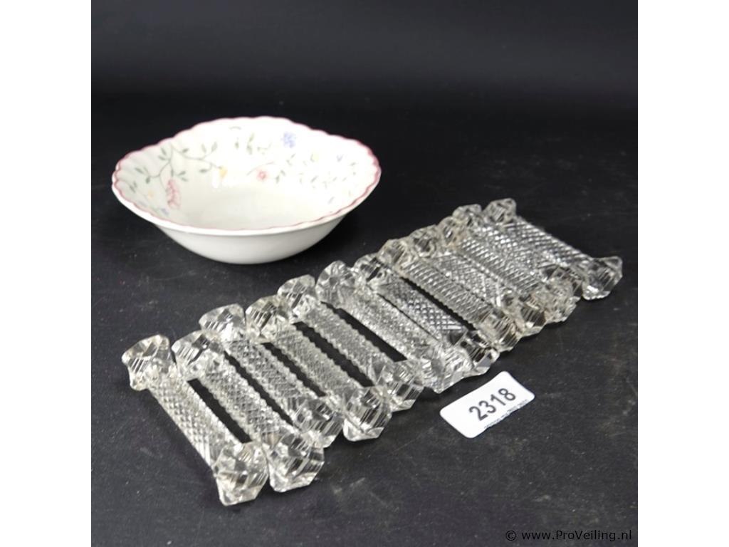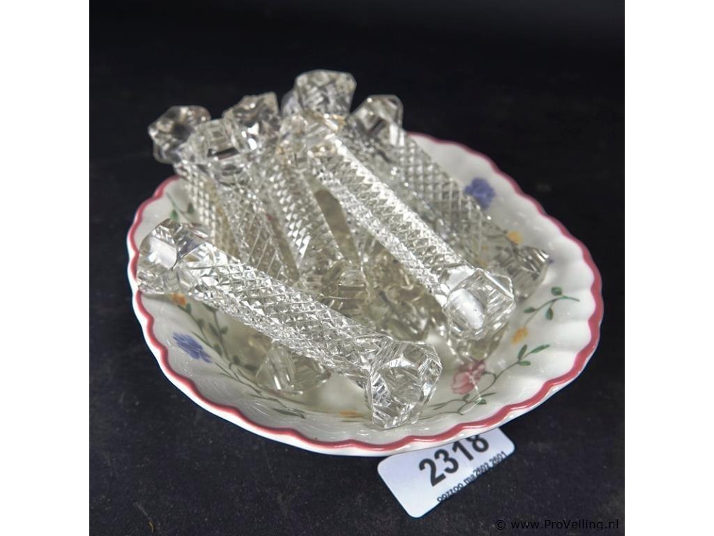 Verzameling kristallen messenleggers in johnson brothers schaal