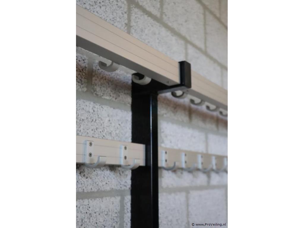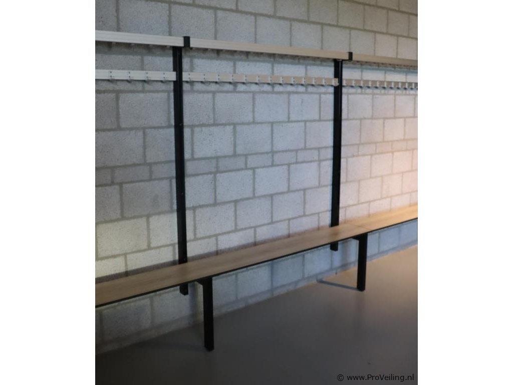 Kleedkamerbank met kapstok; afmetingen ca. 562x39x175cm; zithoogte ca. 49cm; zit aan de muur vast geschroefd; door koper zelf vakkundig te demonteren op aanwijzing van ProVeiling.