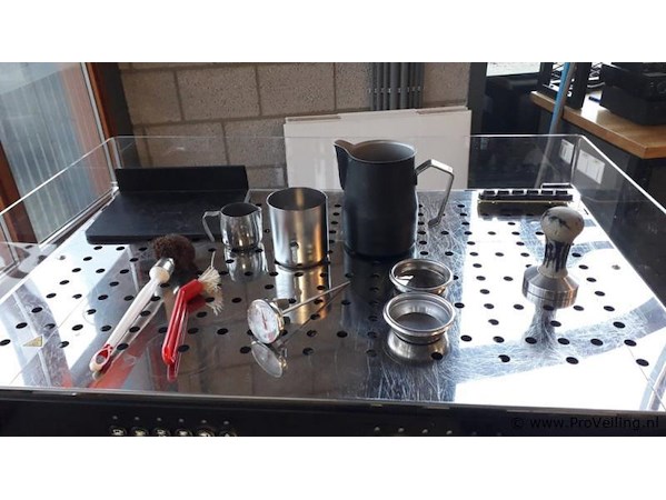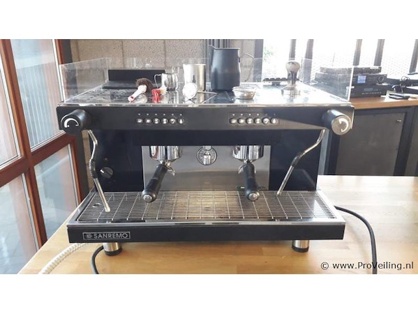 Espressomachine: merk San Remo Zoe met serienummer M67496, inclusief 3 portafilters; aangeschaft in februari 2018 voor een nieuwprijs van € 3.206,50 incl. BTW. Incl. melkkannetje; zie afbeeldingen. Afmetingen espressomachine ca. 72x50x54cm.