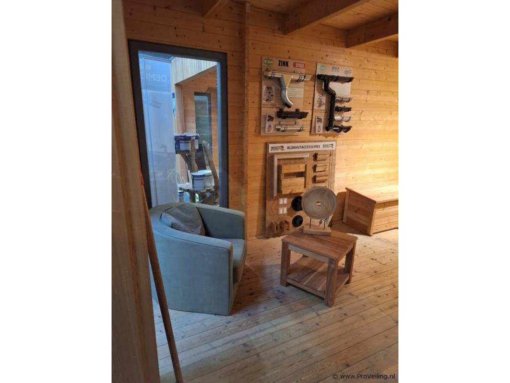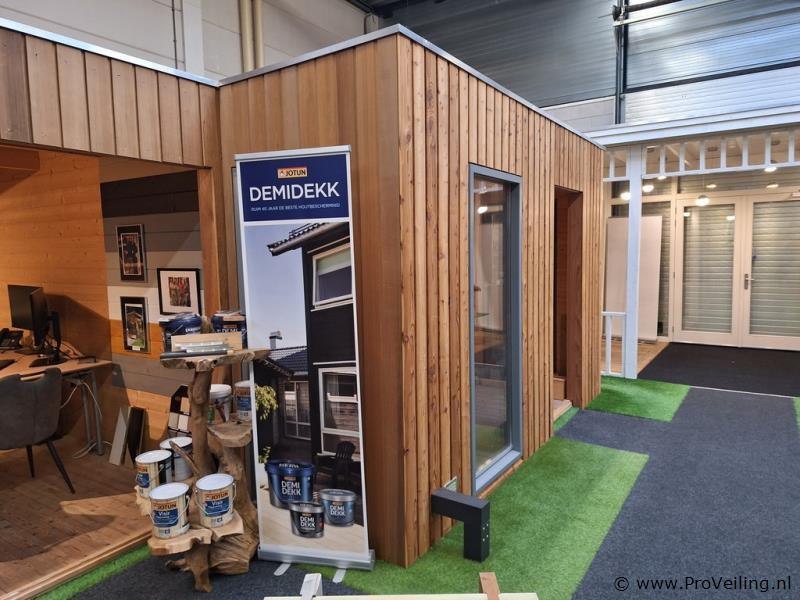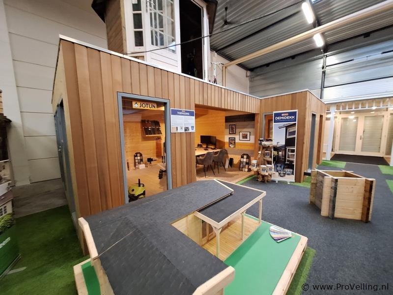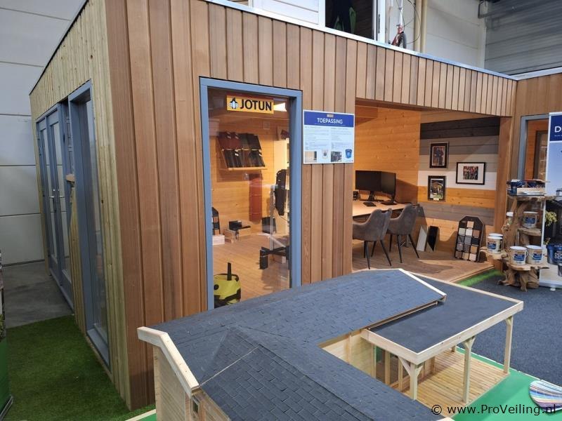 Tuinkantoor; bestaande uit 2 delen; 4x5 m en 5x4 m; materiaal: half rabat half vuren; door koper zelf vakkundig te demonteren op aanwijzing van ProVeiling. Excl. Inhoud.