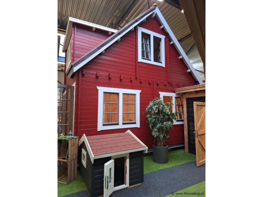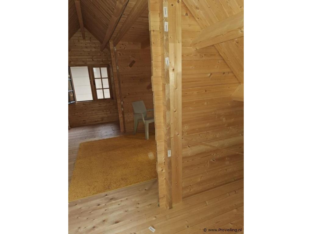 Houten chalet, afmetingen ca. 550x500x550cm; door koper zelf vakkundig te demonteren op aanwijzing van ProVeiling. Excl. inventaris.