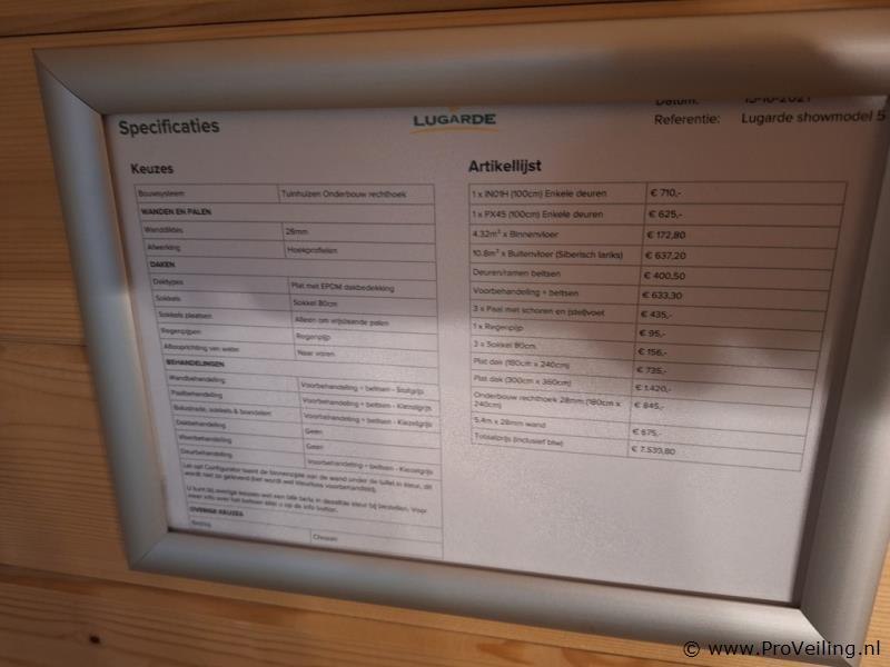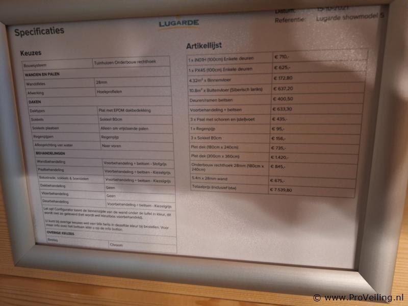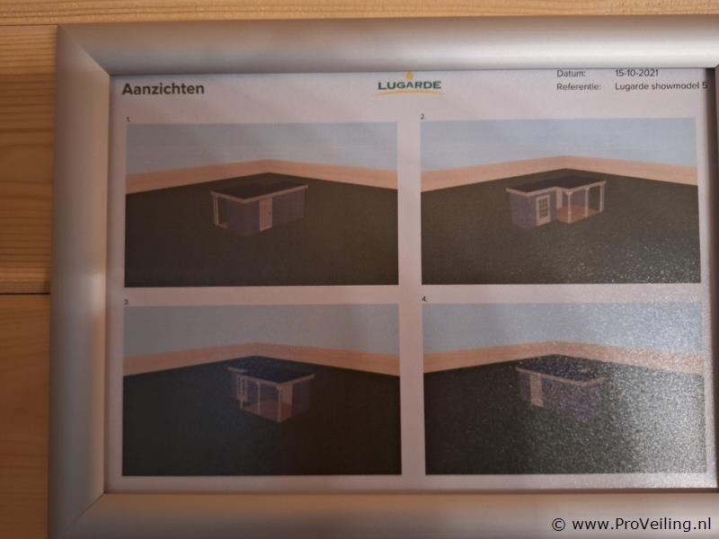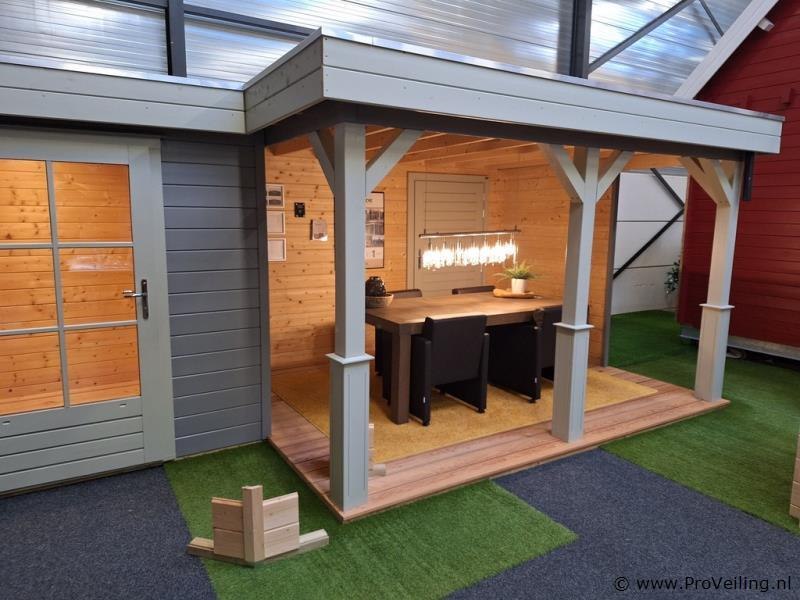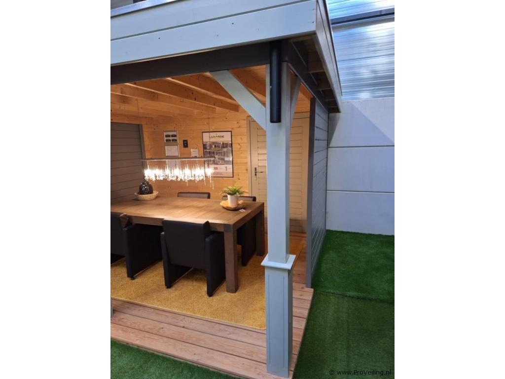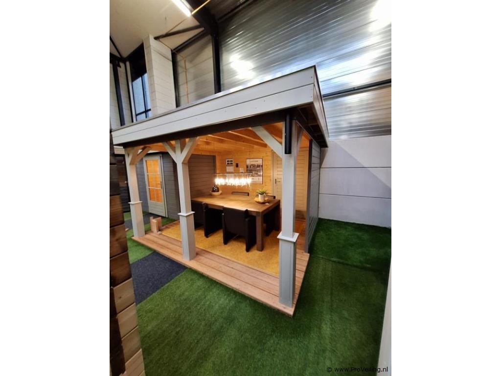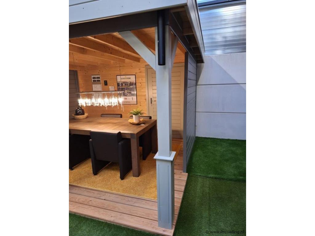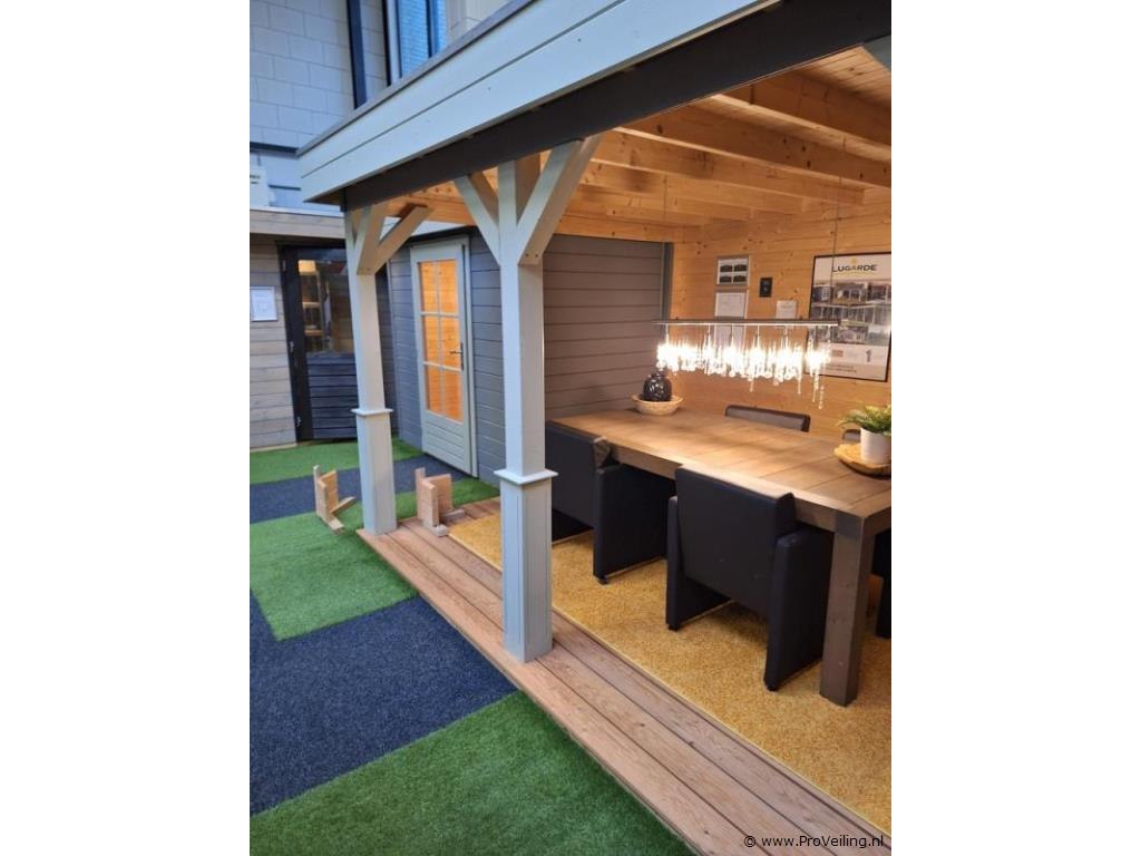 Lugarde showmodel vuren tuinhuis met overkapping, afmetingen ca. 636x180cm; door koper zelf vakkundig te demonteren op aanwijzing van ProVeiling. Excl. Inhoud.
