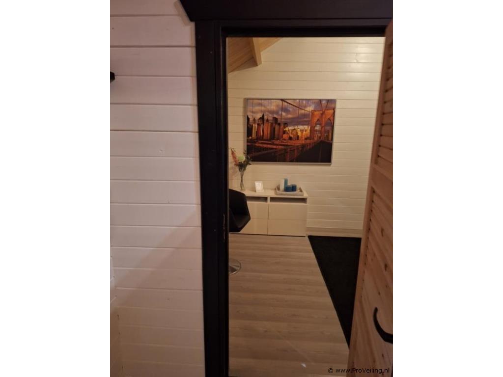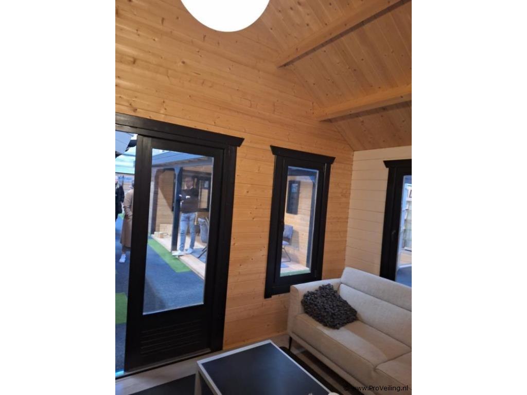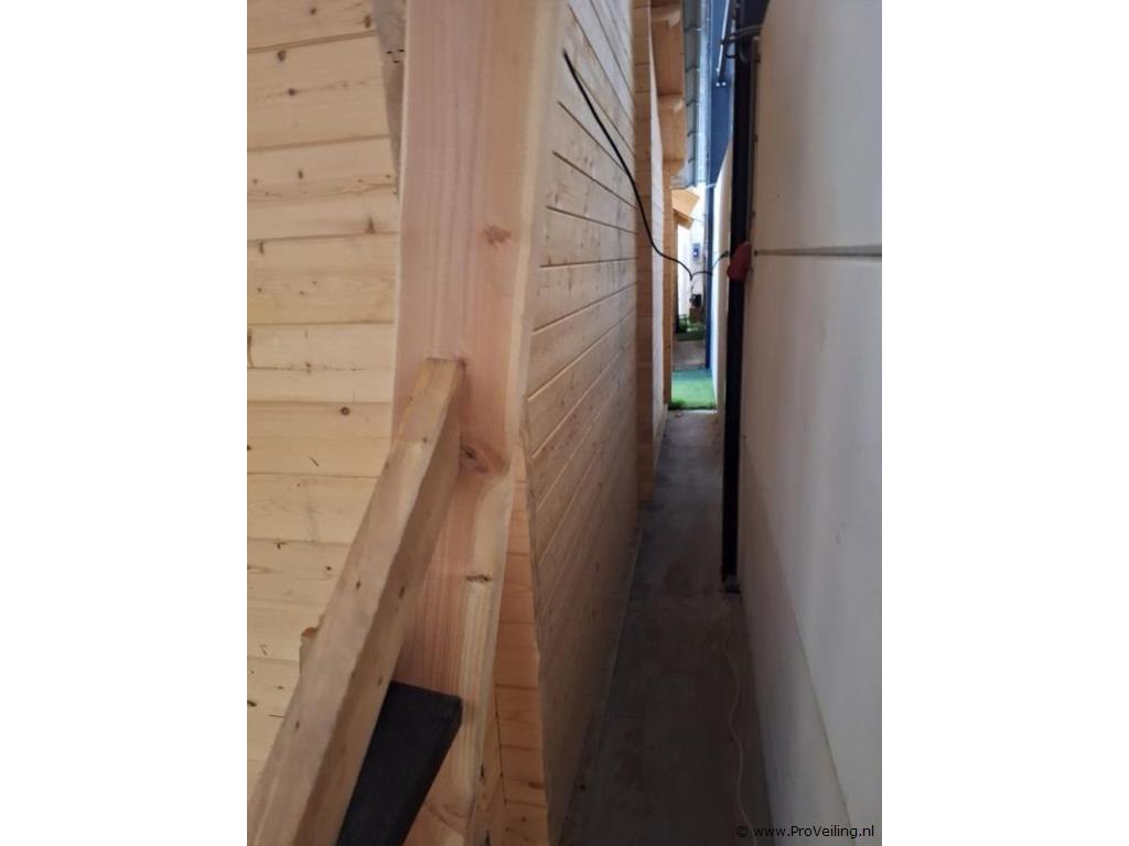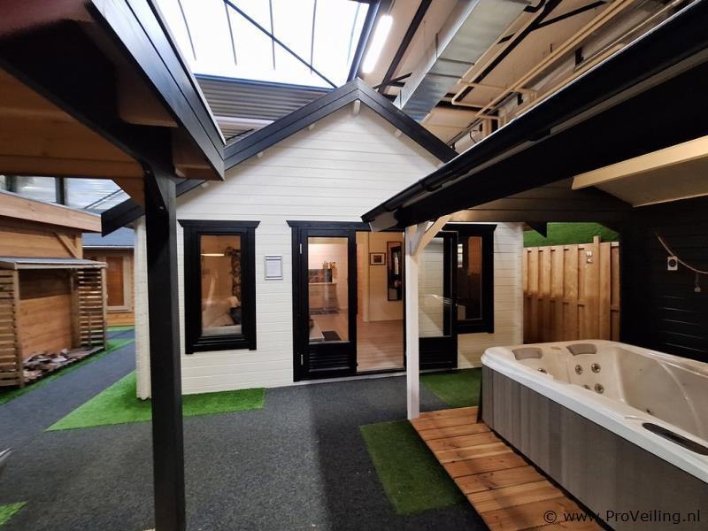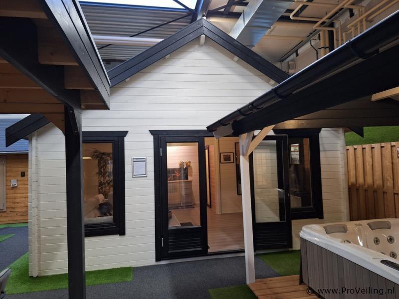 Woodpro vuren tuinhuis met overkapping, afmetingen ca. 600x950cm; door koper zelf vakkundig te demonteren op aanwijzing van ProVeiling. Excl. Inhoud.