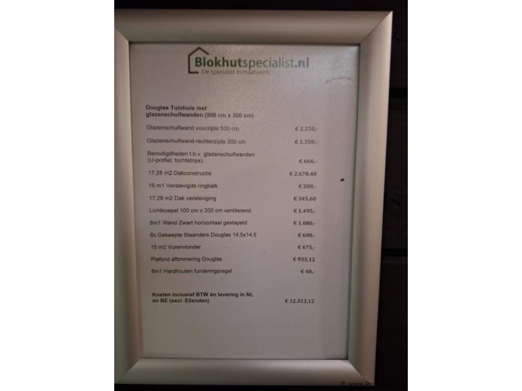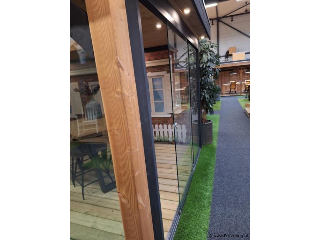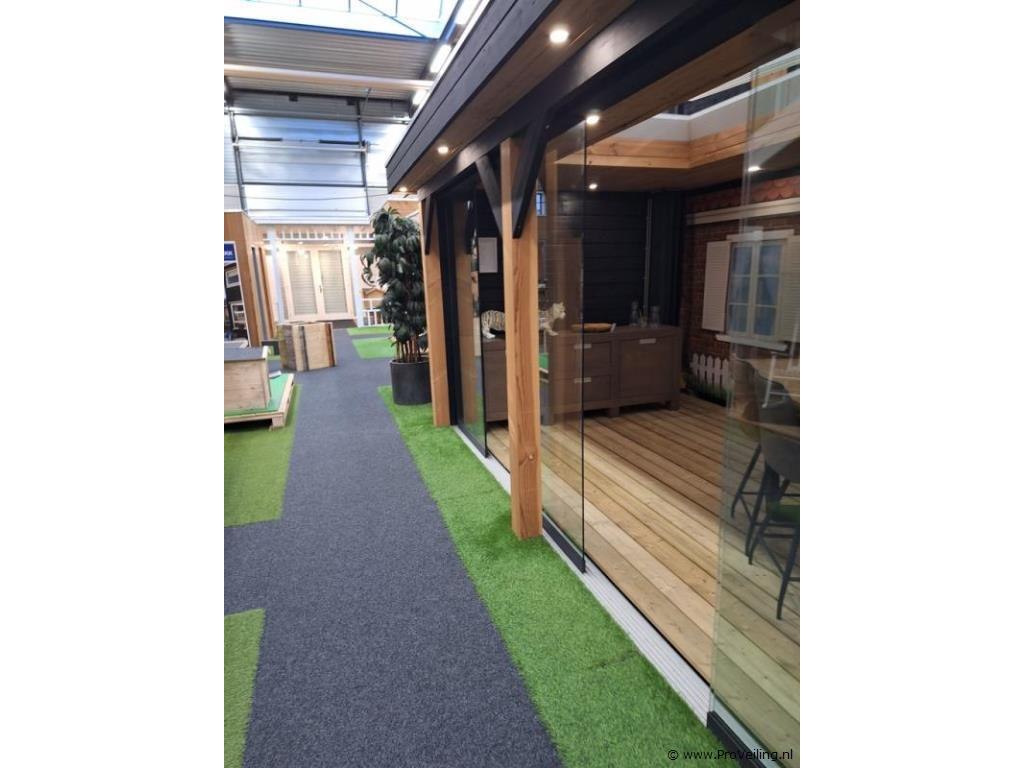 Tuinhuis Douglas/vuren met glazen schuifwanden; afmetingen ca. 540x320x247 cm; zonder achterwand; door koper zelf vakkundig te demonteren op aanwijzing van ProVeiling. Excl. inventaris.