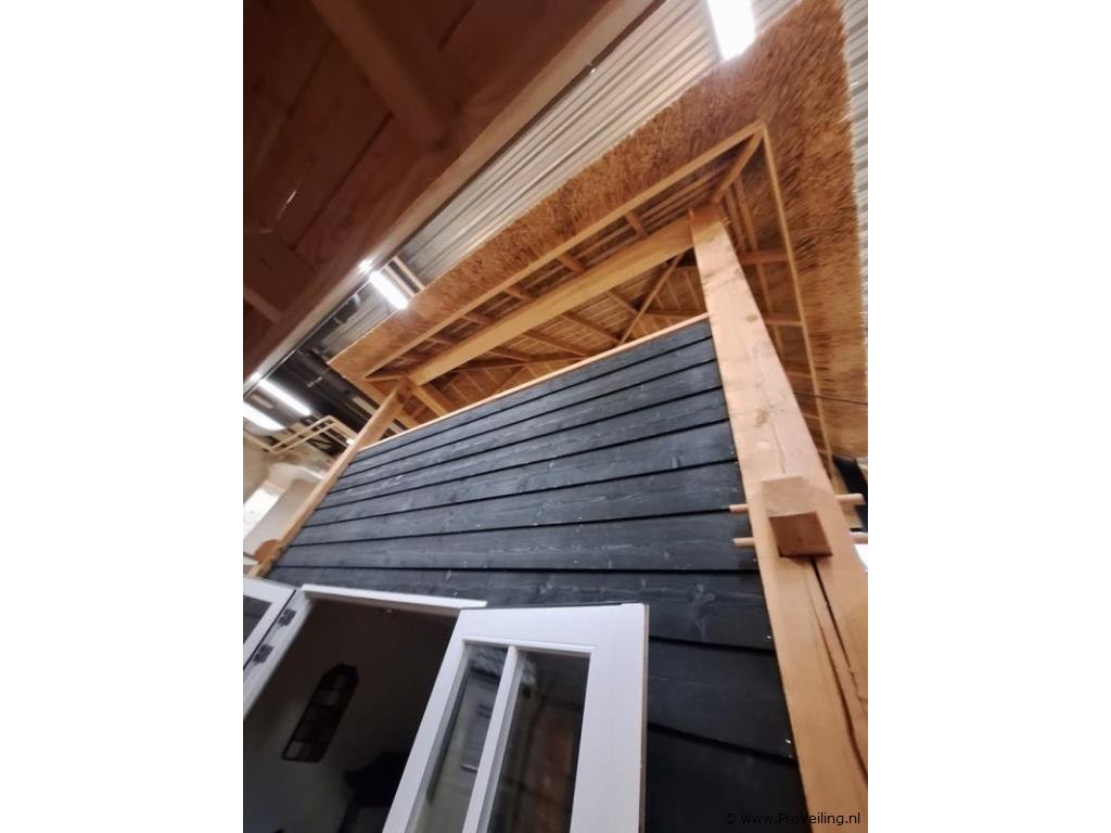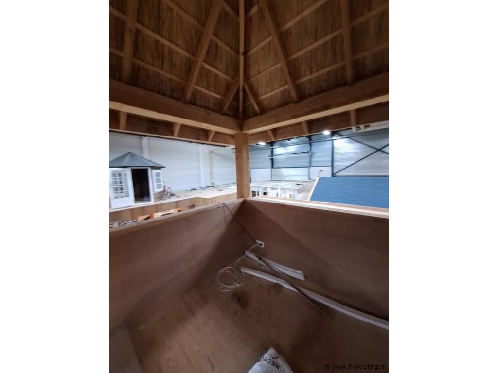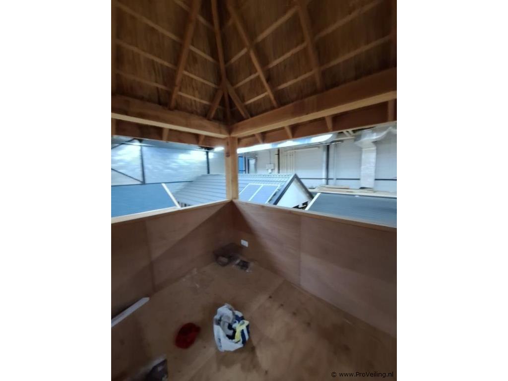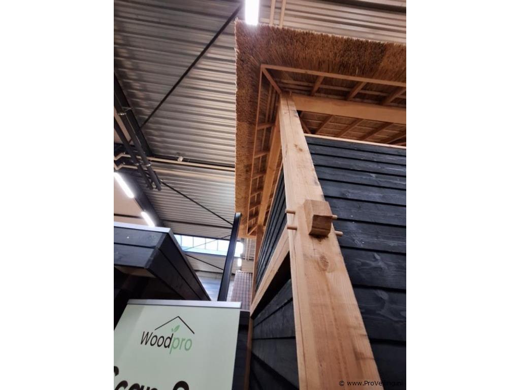 Woodpro houten tuinhuis; afmetingen ca. 410x410x750cm; door koper zelf vakkundig te demonteren op aanwijzing van ProVeiling. Excl. inhoud.