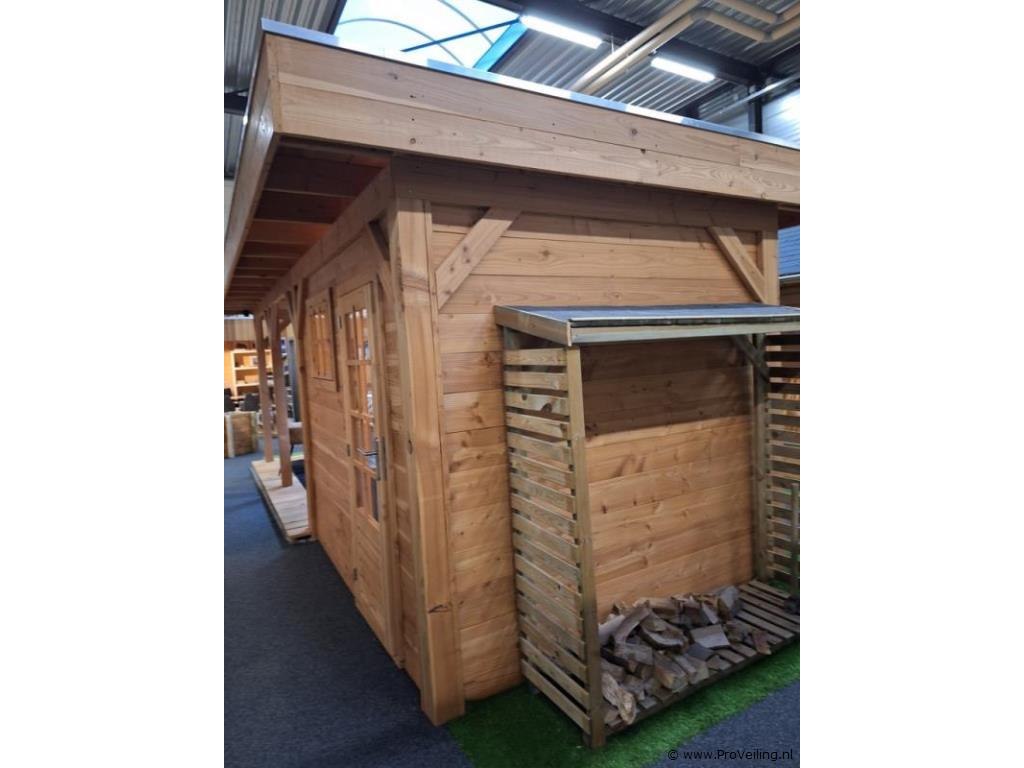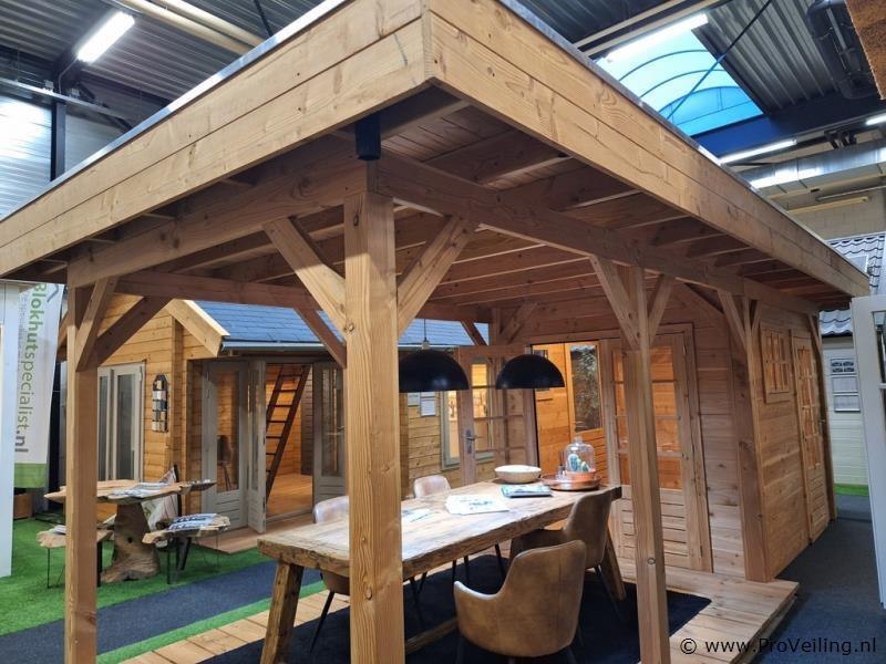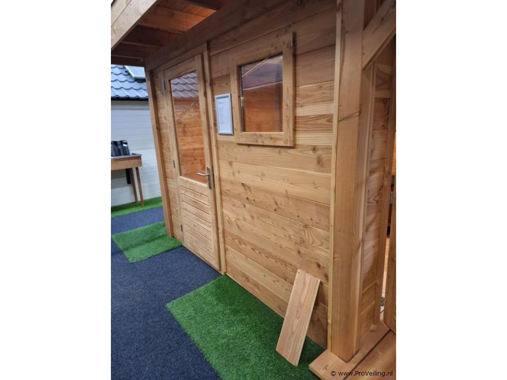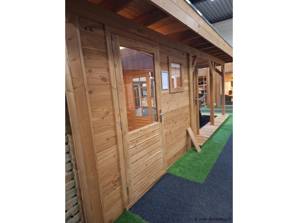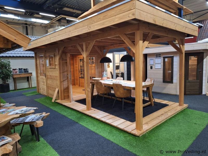 Douglas tuinhuis met veranda; afmetingen ca. 700x250cm; door koper zelf vakkundig te demonteren op aanwijzing van ProVeiling. Excl. Inhoud.