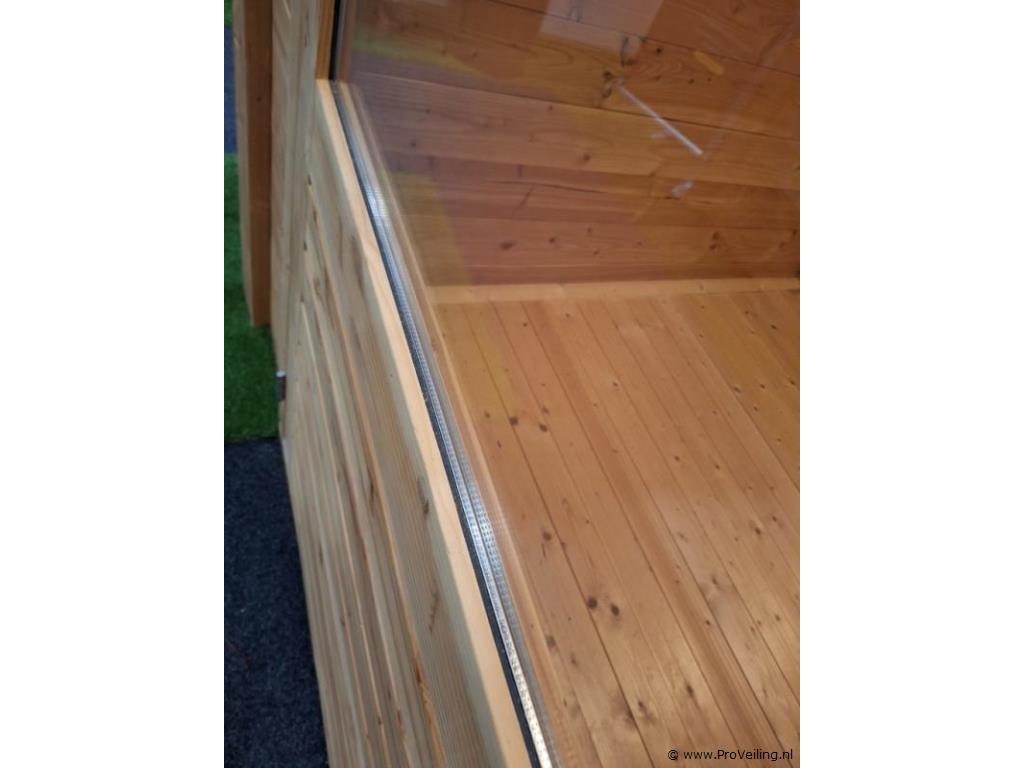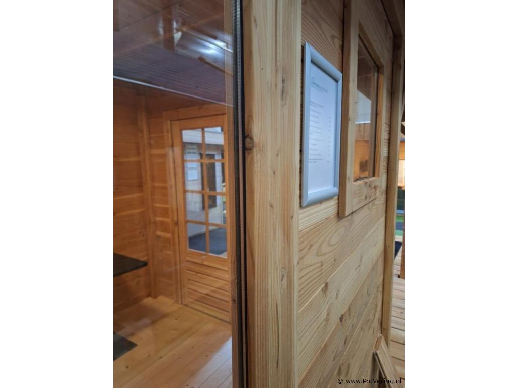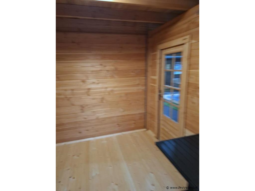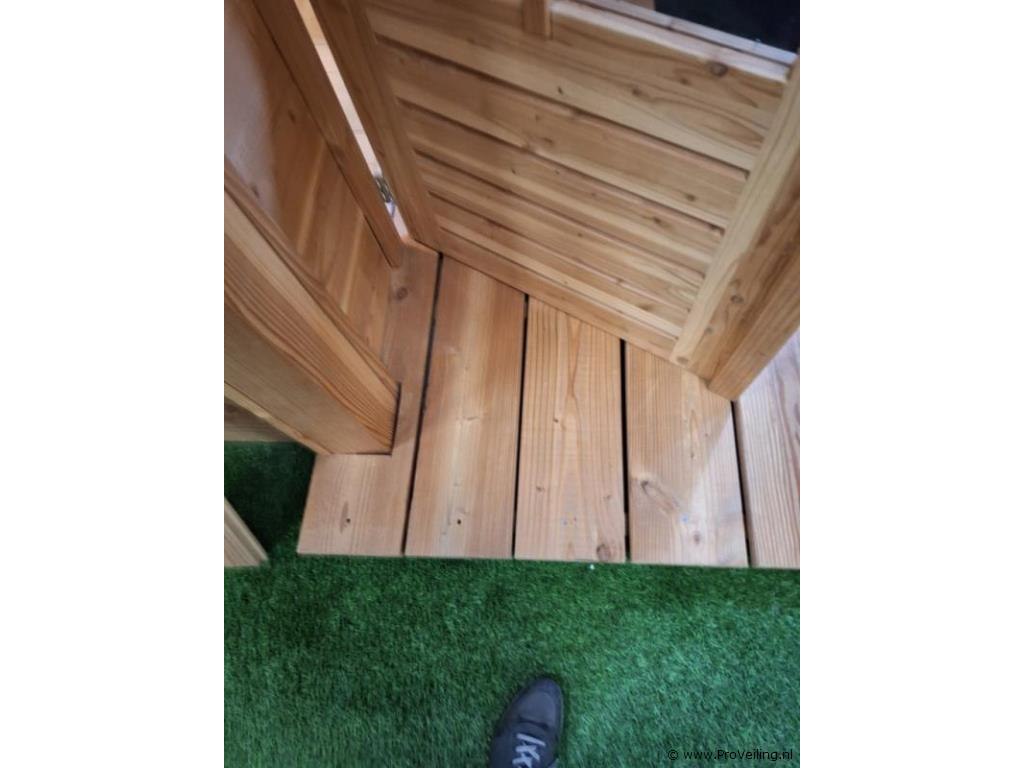 Douglas tuinhuis met veranda; afmetingen ca. 700x250cm; door koper zelf vakkundig te demonteren op aanwijzing van ProVeiling. Excl. Inhoud.