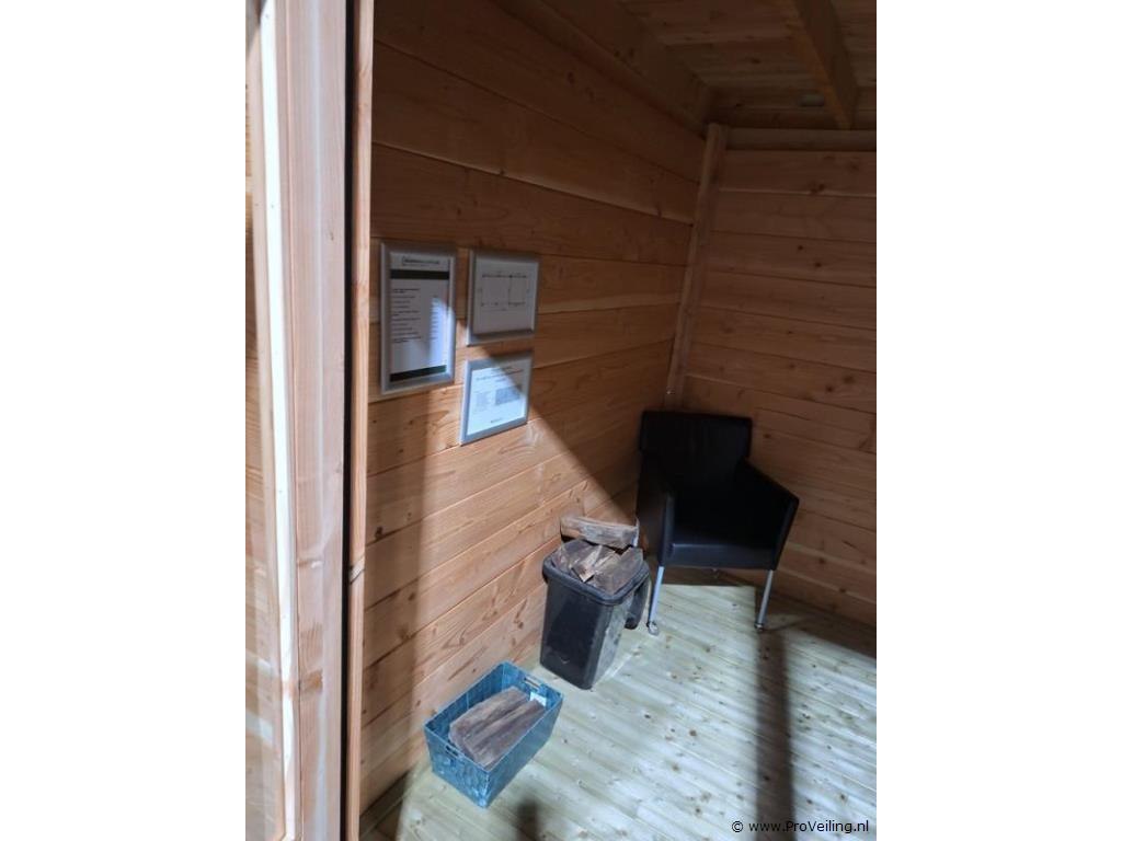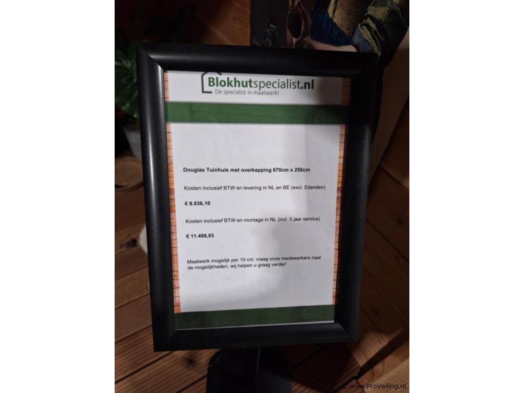 Tuinhuis (Douglas) met overkapping; afmetingen ca. 670x250cm; door koper zelf vakkundig te demonteren op aanwijzing van ProVeiling. Excl. inventaris.