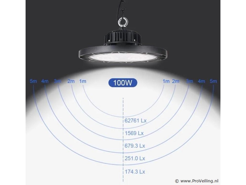 8 x Highbay UFO 100 Watt LED in PRO-ontwerp biedt hoge efficiëntie met 12.000 lumen bij 100 lumen per watt - Uitgerust met Professioneel LED voor superieure helderheid en betrouwbaarheid - Dimbaar met een schakelaar die 3 verschillende standen biedt: 60%/80%/100% vermogen - Aangedreven door een hoogwaardige Lifud-driver. die stabiele prestaties garandeert - Koud wit licht bij 6500K voor heldere. duidelijke verlichting - Waterdicht met een IP65-classificatie. ideaal voor zowel binnen- als buitengebruik - Afmetingen: Ø 260mm x 102mm voor eenvoudige installatie - Duurzame constructie van gegoten aluminium met een PC-lens. met een levensduur van 30.000 uur - 90° stralingshoek voor brede lichtdekking - Energiezuinig met een power factor 0.95 - Hoge CRI 80 voor nauwkeurige kleurweergave - Compatibel met 110-265V - Geleverd met 5 jaar garantie voor gemoedsrust - Weinig onderhoud door de lange levensduur - Efficiënte warmteafvoer voorkomt oververhitting - Milieuvriendelijk en kosteneffectief. verlaagt de energierekening - Biedt flikkervrij. stabiel licht.
