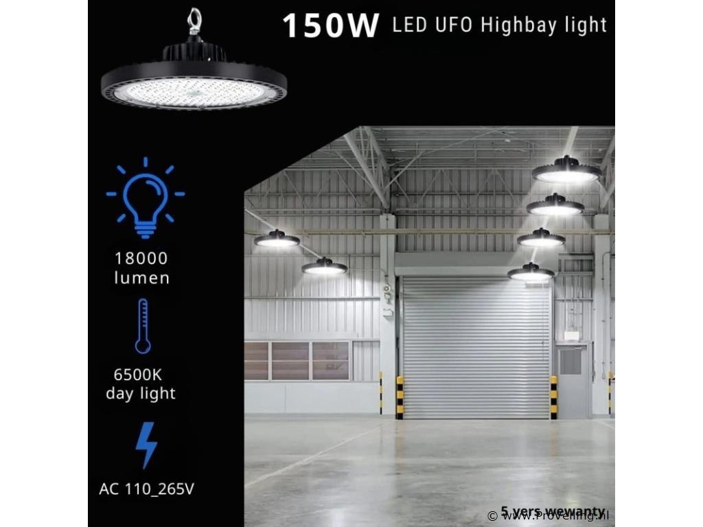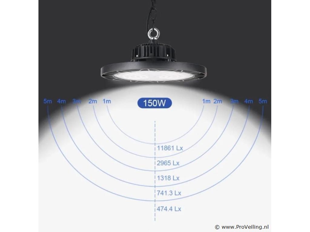 4 x Highbay UFO 150 Watt LED PRO design biedt hoge efficiëntie met 18.000 lumen bij 120 lumen per watt - Uitgerust met Professioneel LED voor superieure helderheid en betrouwbaarheid - Dimbaar met een schakelaar die 3 verschillende standen biedt: 60%/80%/100% vermogen - Aangedreven door een hoogwaardige Lifud-driver. die stabiele prestaties garandeert - Koud wit licht bij 6500K voor heldere. duidelijke verlichting - Waterdicht met een IP65-classificatie. ideaal voor zowel binnen- als buitengebruik - Afmetingen: Ø 310mm x 102mmmm voor eenvoudige installatie - Duurzame constructie van gegoten aluminium met een PC-lens. met een levensduur van 30.000 uur - 90° stralingshoek voor brede lichtdekking - Energiezuinig met een power factor 0.95 - Hoge CRI 80 voor nauwkeurige kleurweergave - Compatibel met 110-265V - Geleverd met 5 jaar garantie voor gemoedsrust - Weinig onderhoud door de lange levensduur - Efficiënte warmteafvoer voorkomt oververhitting - Milieuvriendelijk en kosteneffectief. verlaagt de energiekosten - Biedt flikkervrij. stabiel licht.