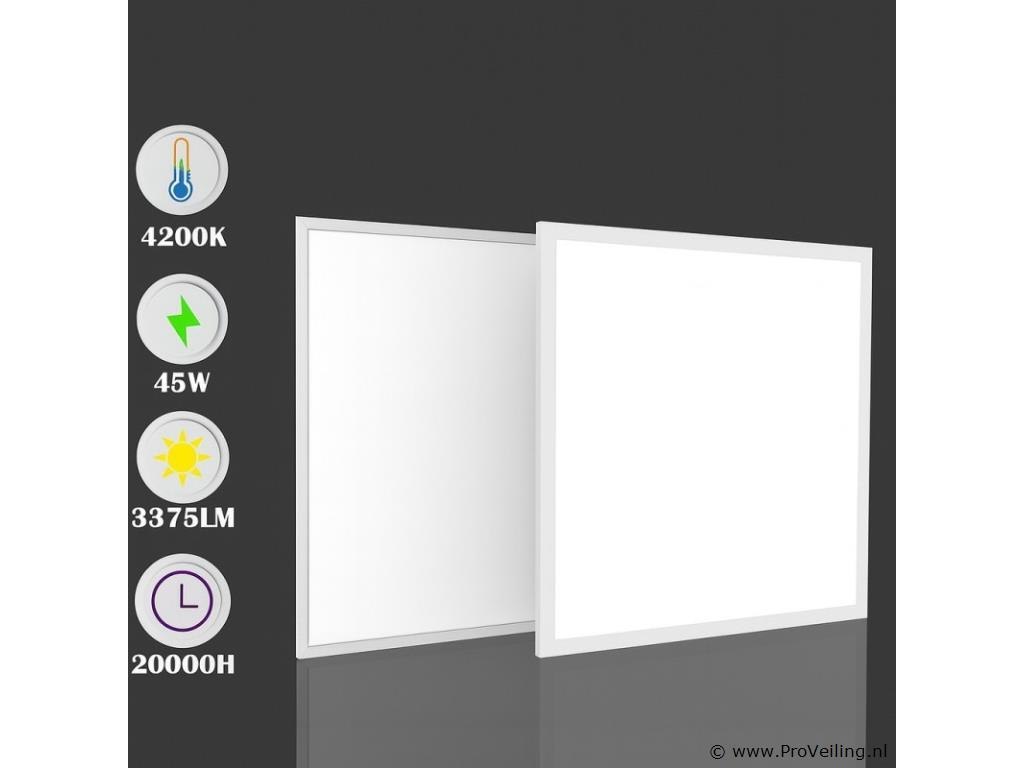 8 x LED-paneel 45W – 60 × 60 cm – 4200K – Super ECO – Wattage: 45W. Lichtopbrengst: 3375 lm. Kleurtemperatuur: 4200K (Neutraal wit). Spanning: 175–265 V AC / 50–60 Hz. LED-type: SMD LED. Kleur: Wit. Beschermingsgraad: IP20 (droge binnenruimtes). Lichtspreidingshoek: 120°. Afmetingen: 595 × 595 × 35 mm. Detail: Backlight paneel. Levensduur: ± 20.000 uur – IRC: 80 Ra – LED-type:SMD – Beamhoek: 120° – Inclusief transformator – Efficiënte en gelijkmatige lichtverdeling – Super ECO. energiezuinig en milieuvriendelijk ontwerp – Geschikt voor gebruik binnenshuis.