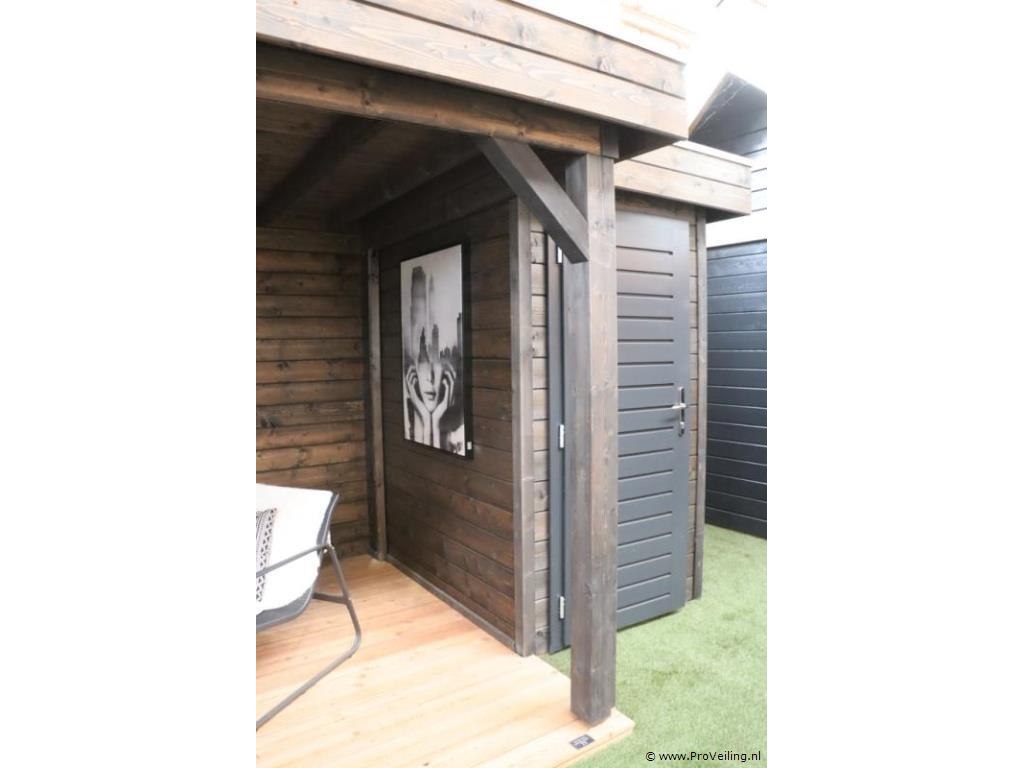 Tuinhuis (Vuren) met veranda; afmetingen ca. 600x240cm; voorzien van Siberisch Lariks geribbelde vlonderplanken; door koper zelf vakkundig te demonteren op aanwijzing van ProVeiling.