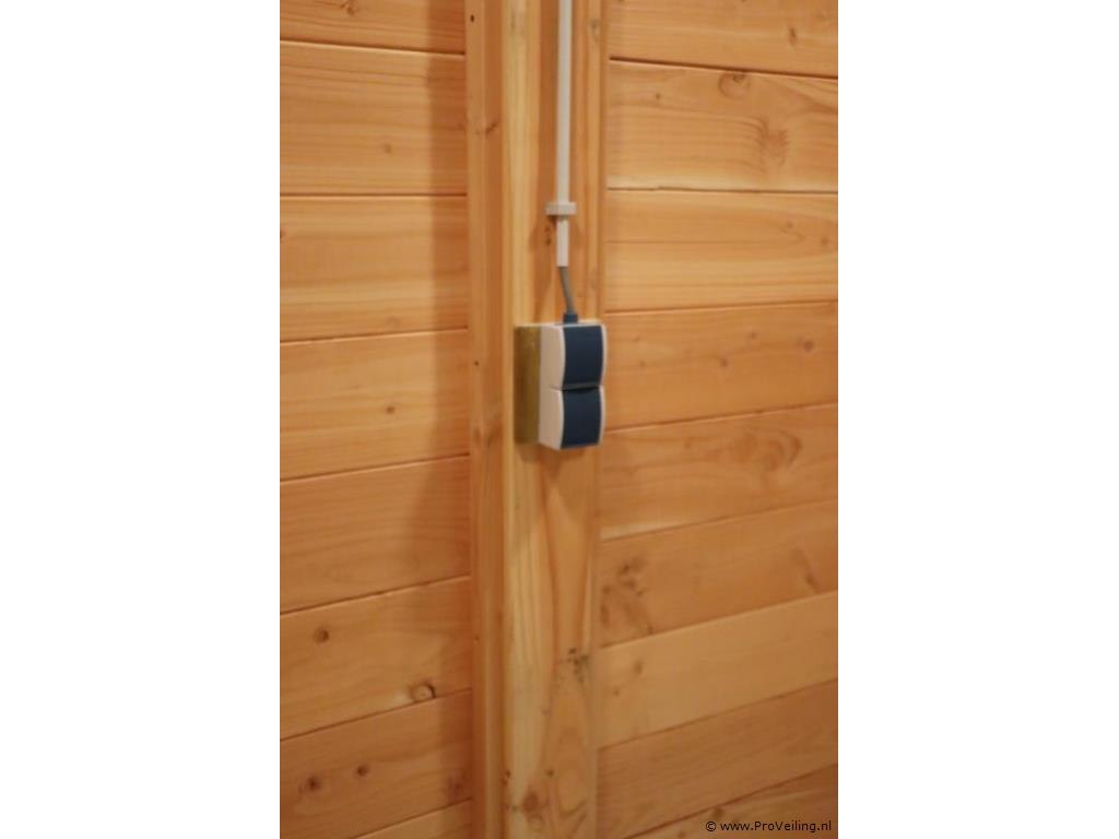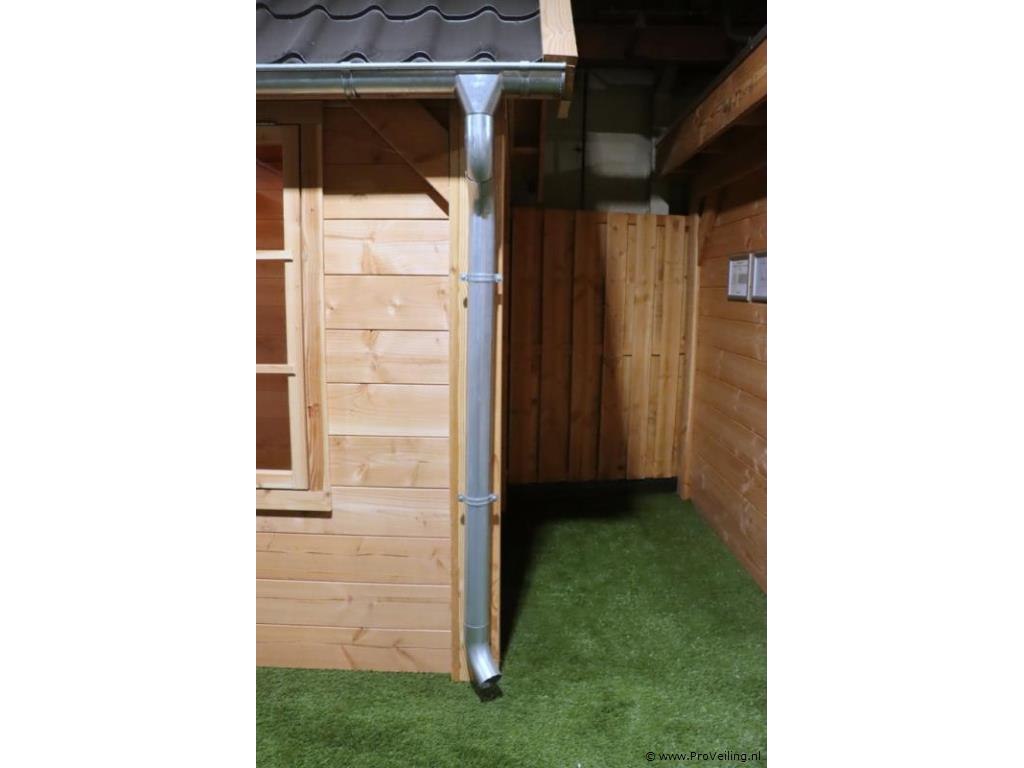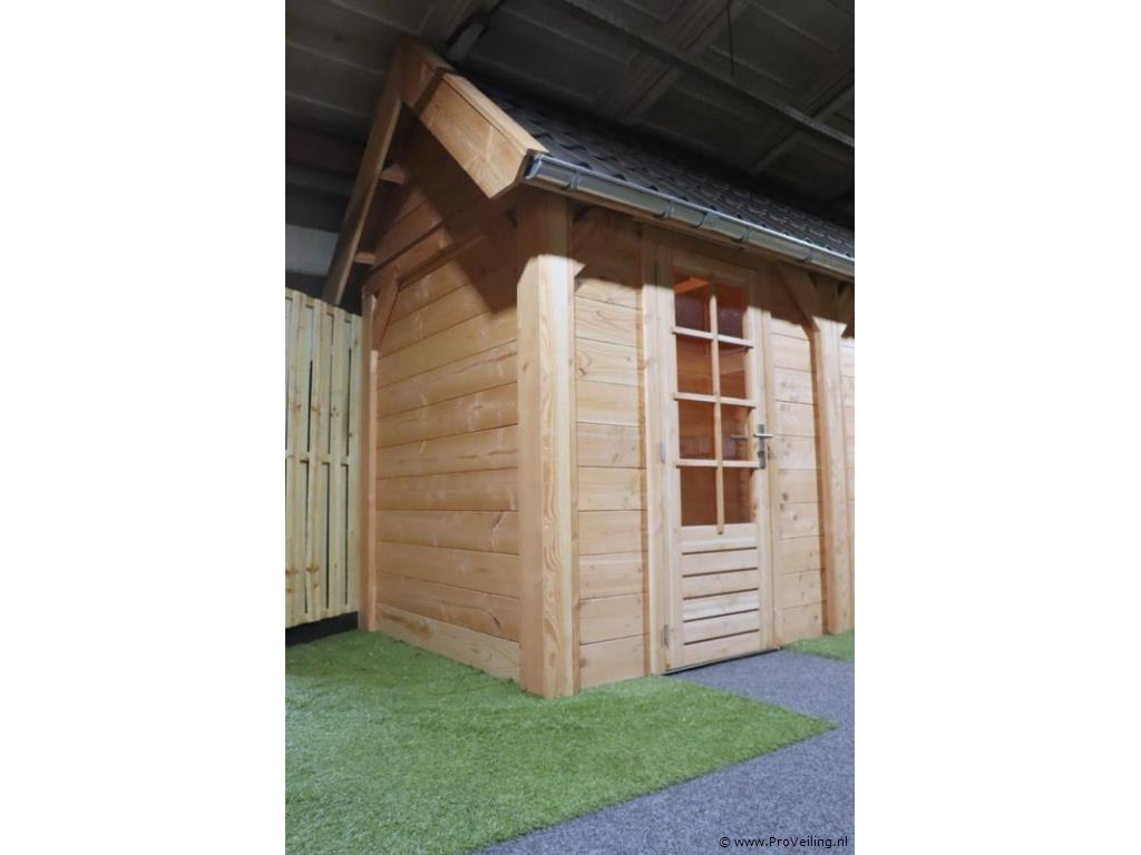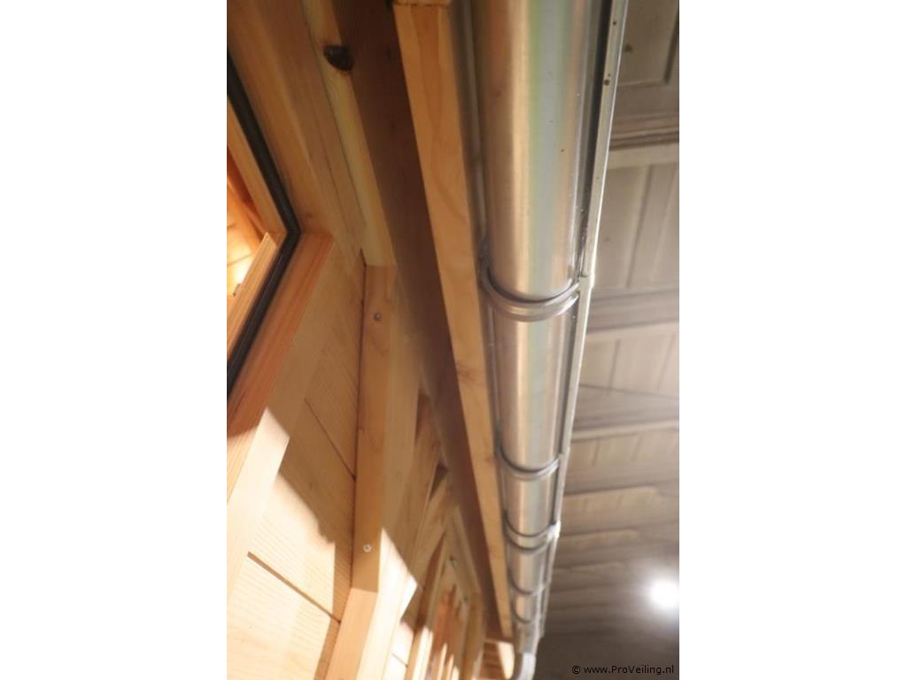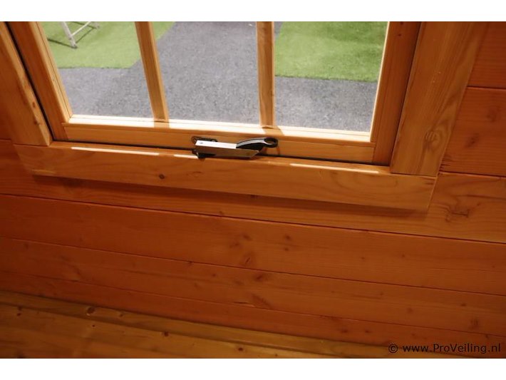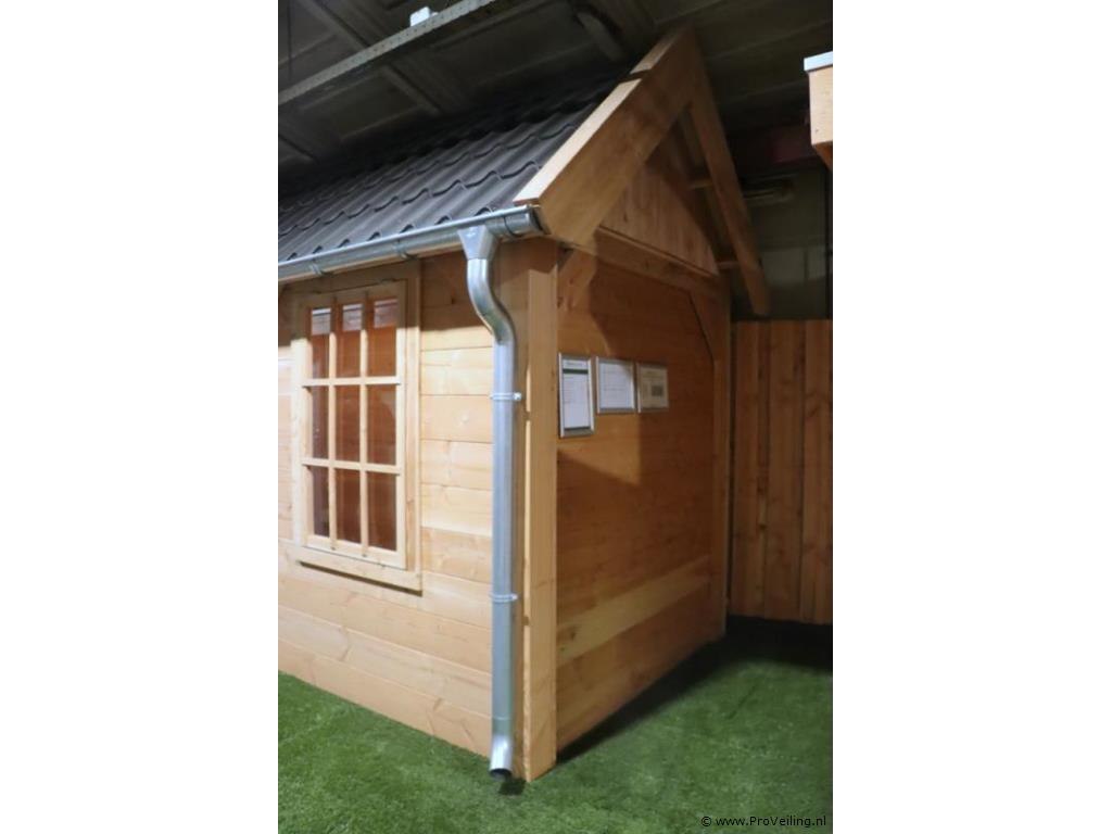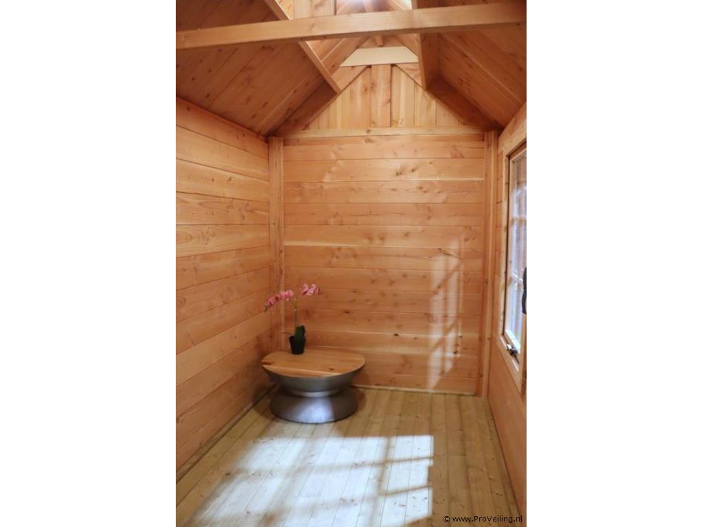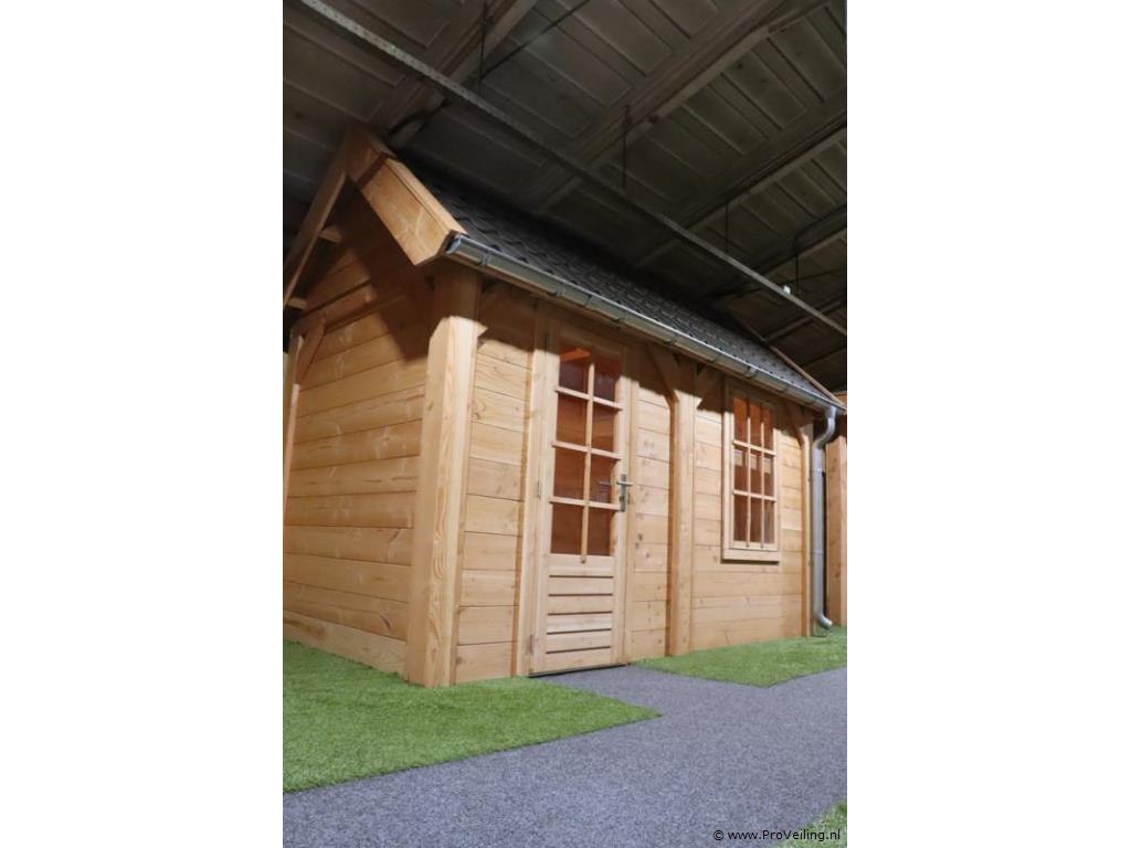 Flexwood tuinhuis (Douglas) met zadeldak; afmetingen ca. 400x200cm; door koper zelf vakkundig te demonteren op aanwijzing van ProVeiling. Excl. inventaris. Attentie: deze blokhut heeft aan 1 kant dakbedekking.