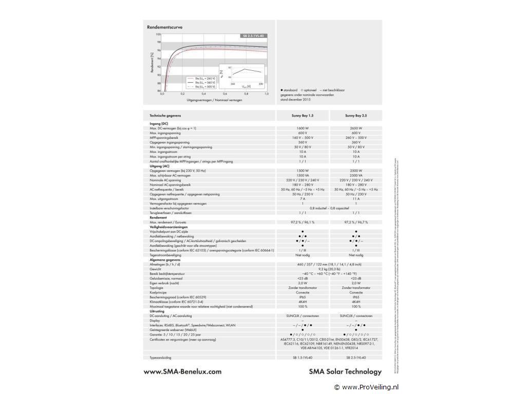 Omvormer van SMA samen met 6 zonnepanelen van 405 Wp All Black van CECEP Solar. De producten zijn nieuw en ongebruikt en hebben volledige fabrieksgarantie. De Sunny Boy 2.5 is, doordat het een compacte en lichtgewicht omvormer is, gemakkelijk en snel te installeren. Geïntegreerde software zorgt er daarnaast voor dat het goed te monitoren is, zowel lokaal als online. Een ander pluspunt is het schaduwmanagement systeem Shadefix, voorheen OptiTrac Global Peak. SMA houdt daarnaast alle aangesloten omvormers automatisch in de gaten via SMA Smart Connected. Door een compact ontwerp en een gewicht van slechts 9kg is de Sunny Boy 2.5 een eenvoudig en snel te installeren omvormer. Er zijn bijvoorbeeld slechts twee schroeven nodig voor montage, zonder de behoefte aan extra montagebeugels. Installatie is gemakkelijk door de geïntegreerde gebruikersinterface die via een smartphone, tablet, laptop of desktop te benaderen is. Nieuwprijs omvormer EUR 600,=!