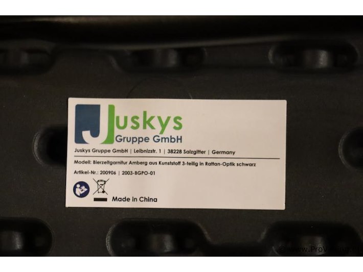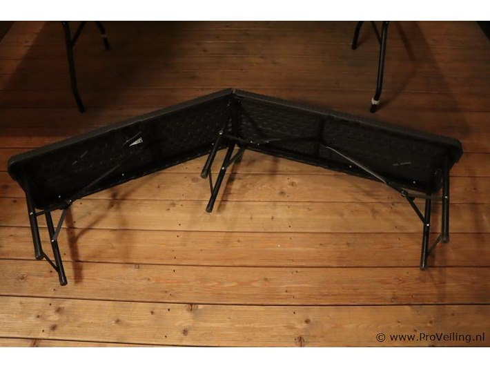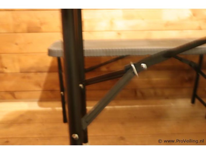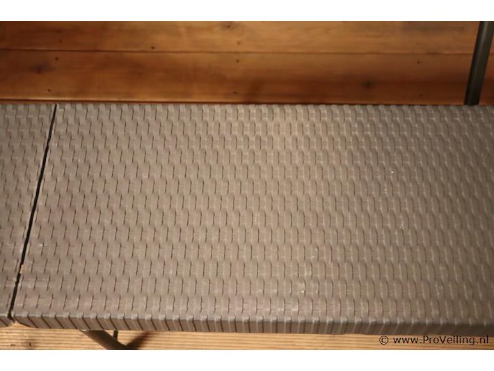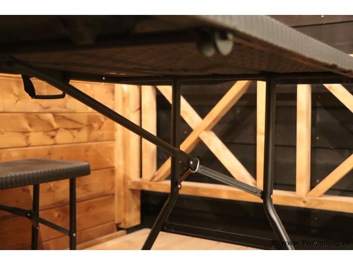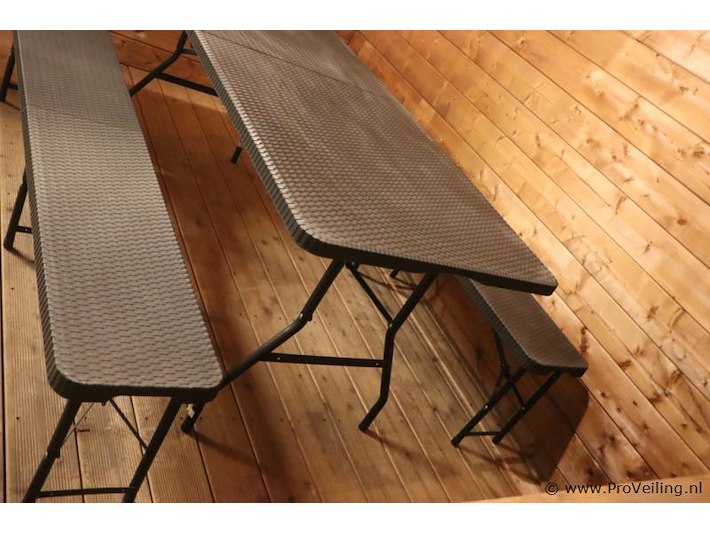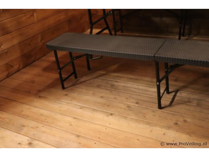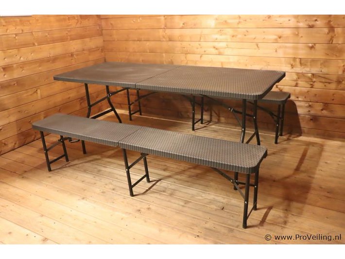 ; materiaal: kunststof; afmetingen tafel ca. 178x72x75cm en bankjes ca. 177x30x43cm; zithoogte ca. 44cm.