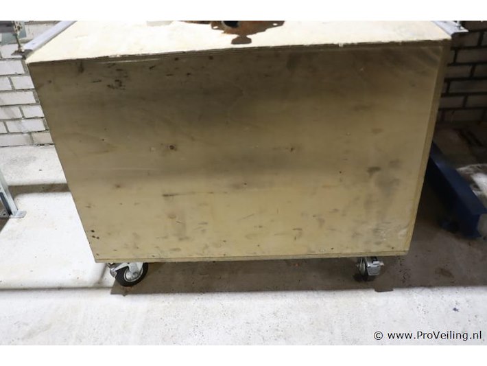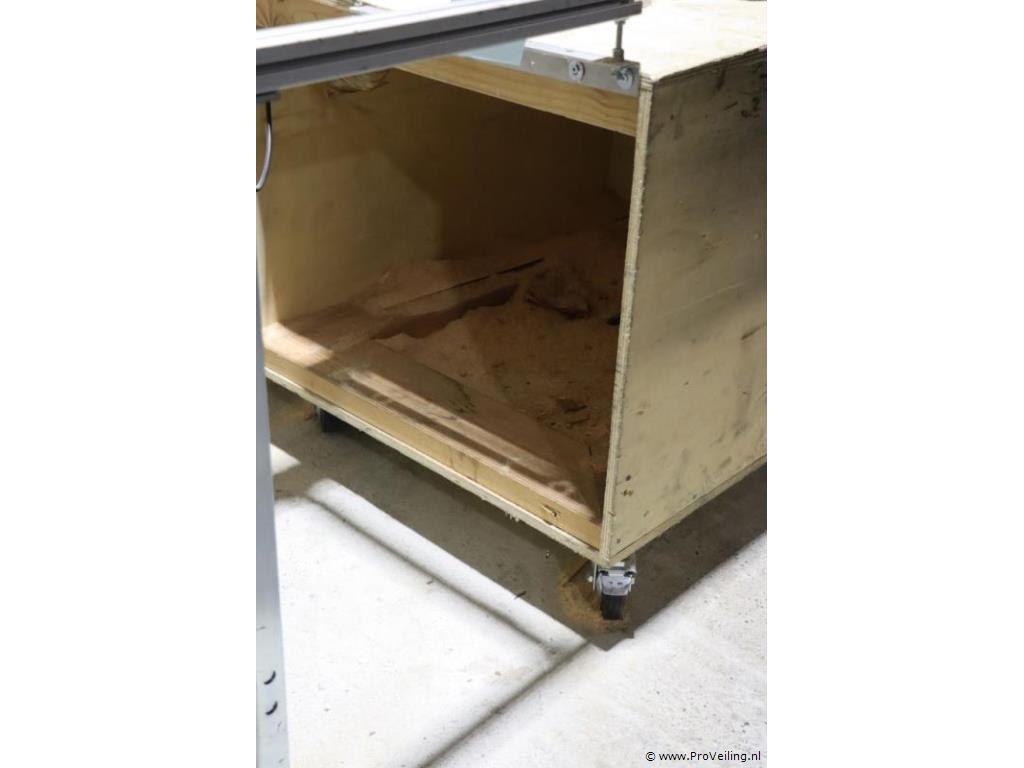 Makita Radiaal afkortzaag LS1019L; incl. afzuiging en houten onderstel op wielen; afmetingen ca. 102x85x160cm.