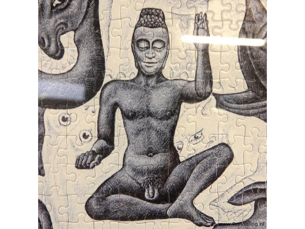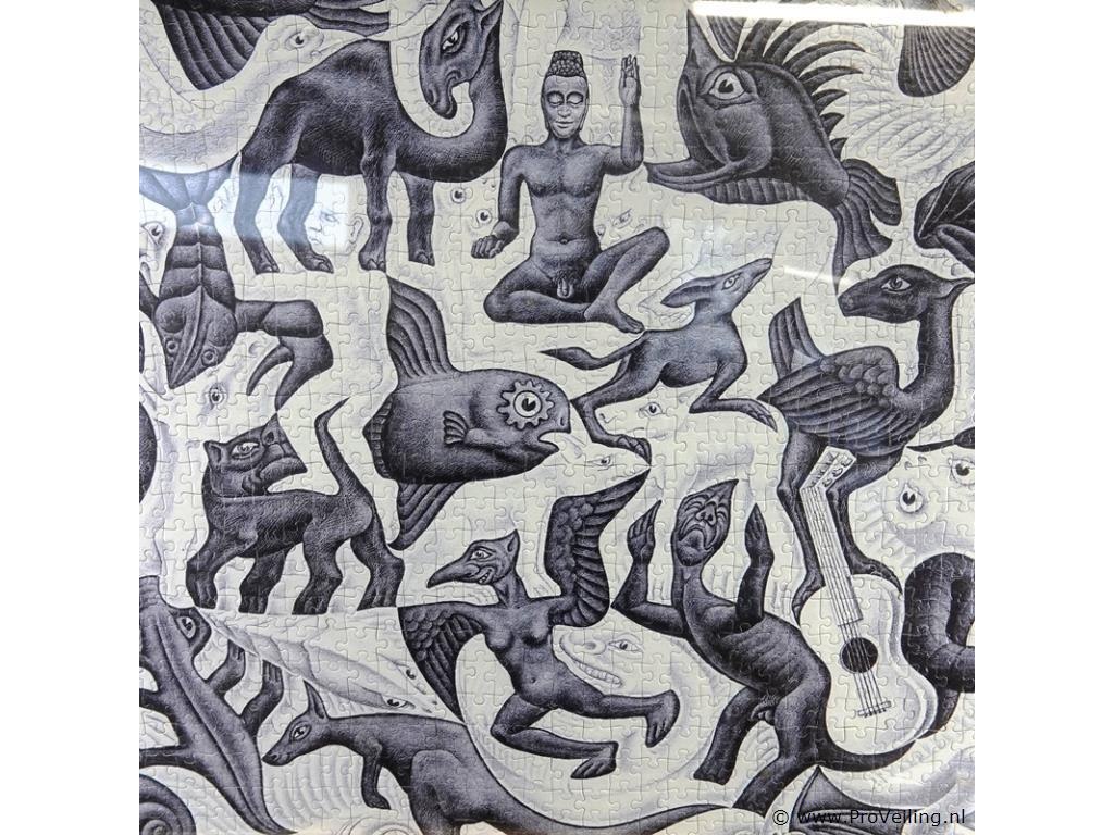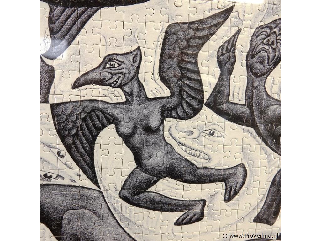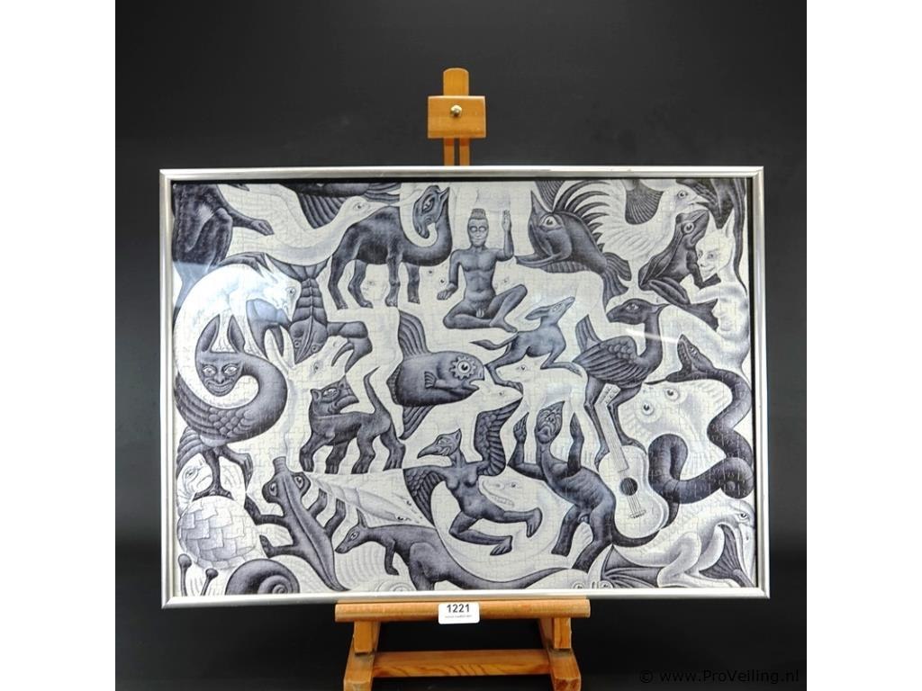 Litho "Vlakvulling II" van M.C. Escher, gemaakt in juli 1957. als puzzel en ingelijst. H52cm/B71cm/3180Gr. Lees a.u.b. ook de extra veilinginformatie voor deze veiling. G-E-E-N transport of bezorging door Proveiling mogelijk. Eventueel transport of bezorging alleen door u zelf te regelen via b.v. www.brenger.nl .