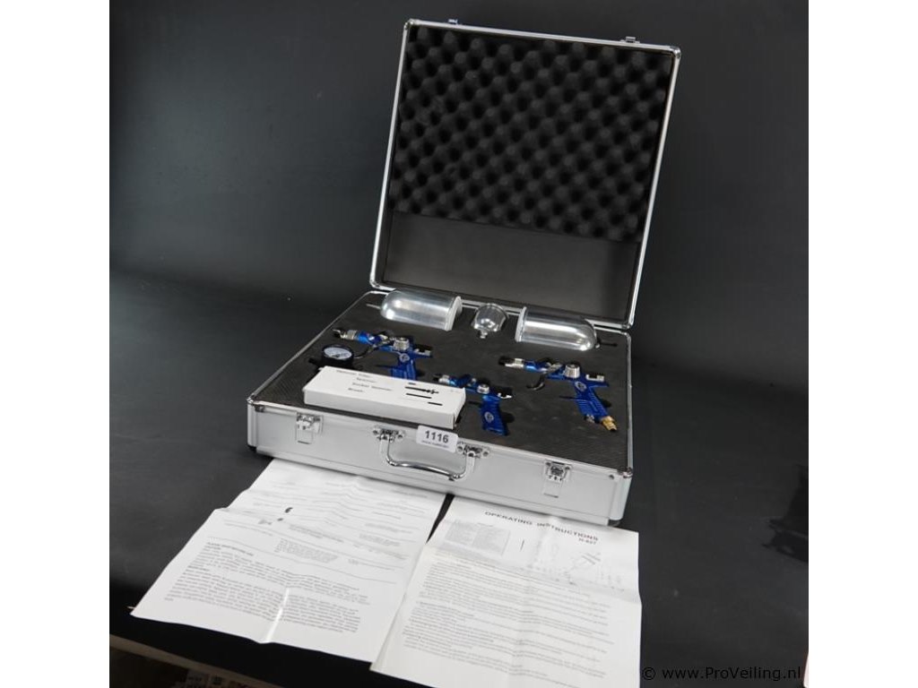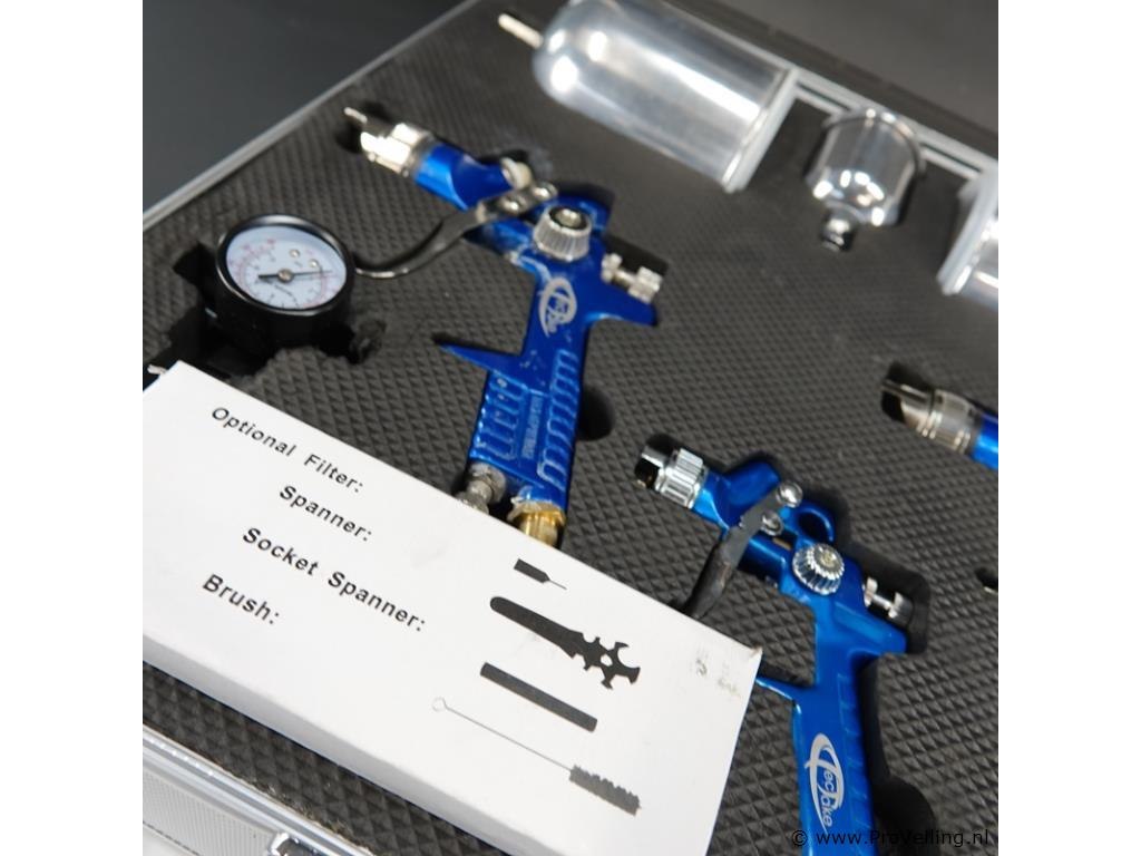 Set ongebruikte pneumatische spuitpistolen in een aluminium koffer.