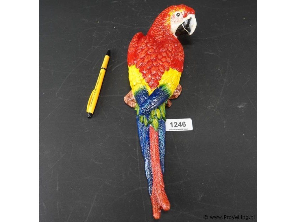 Ijzeren wanddecoratie in de vorm van een rood-gele ara.