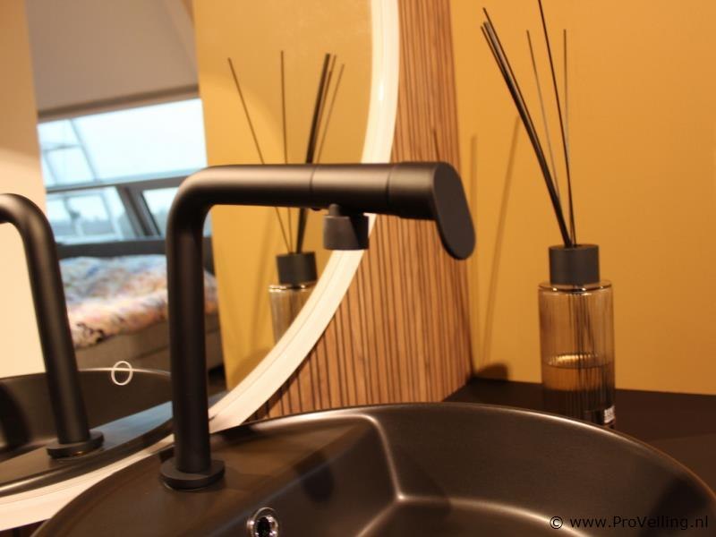 Productnaam: Deens design badkamermeubel Frontkleur: Ultra mat zwart / antraciet Grepen: Greeplooos Afmeting: 158 cm breed x 48 cm diep Afmeting: Spiegel diameter 100 cm Conditie: Showmodel Bijzonderheden: U dient dit meubel zelf te demonteren - Zonder afgebeelde accessoires / materialen (Diversen) op en in het meubel Ter waarde van: € 4985 Productbeschrijving: Deens design met een matte antraciet afwerking - Greeploze fronten met elegante, geïntegreerde uithollingen - Drie brede laden met luxe indeling en soft-close ladesysteem - Wandhangend ontwerp: zorgt voor een ruimtelijk en zwevend effect - Vrijstaande ronde waskom in metallic antraciet - Designmengkraan in matzwart met minimalistisch draaimechanisme - Luxe uitstraling en praktische bediening - ronde designspiegel, strak afgewerkt - geïntegreerde LED-verlichting rondom (op basis van de reflectie zichtbaar - Subtiele Touch sensor voor het in- en uitschakelen van de verlichting. Demontage: U dient dit meubel zelf te demonteren in overleg - meubel bevind zich op etage, goederenlift is aanwezig Conditie: Showroommodel Garantie: Geen