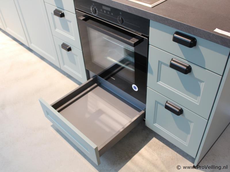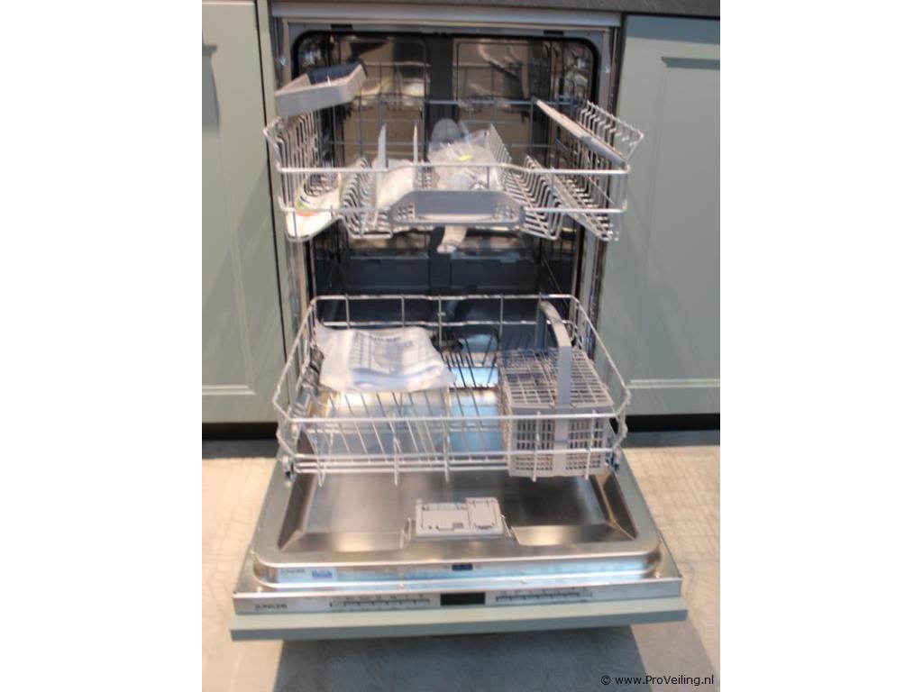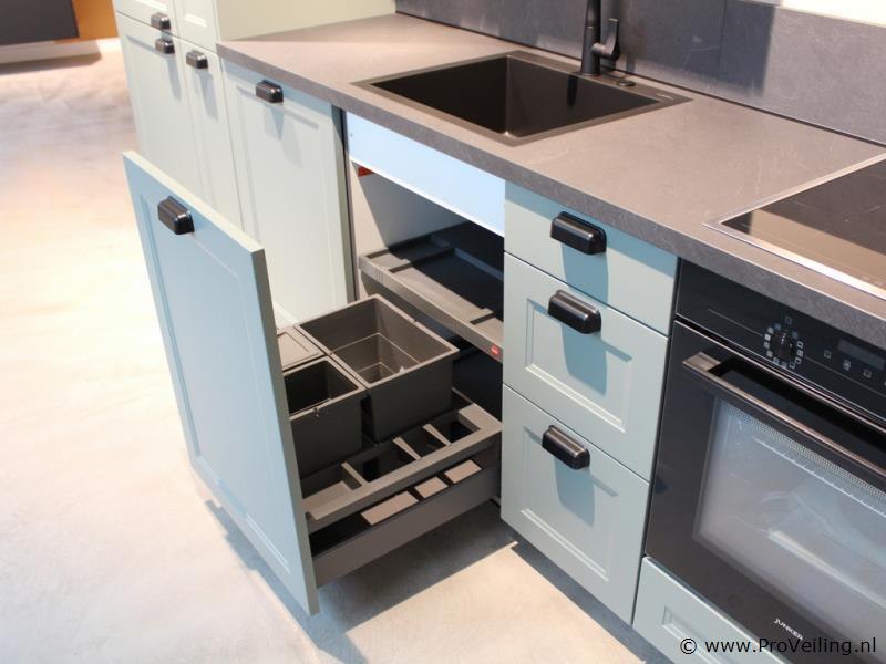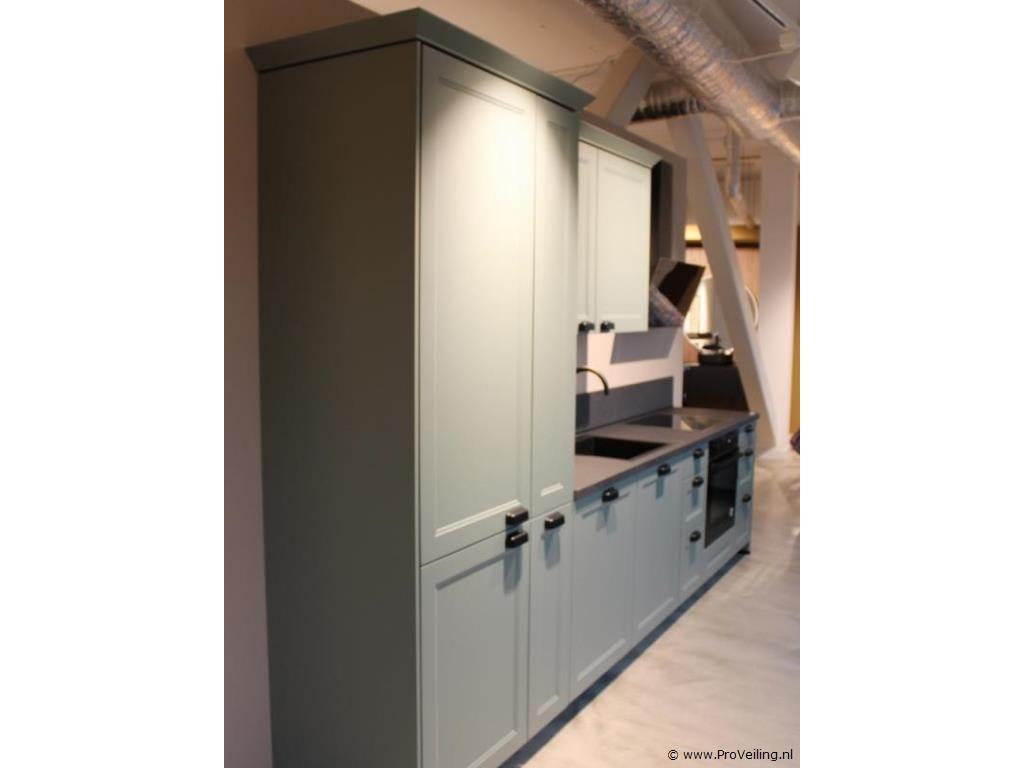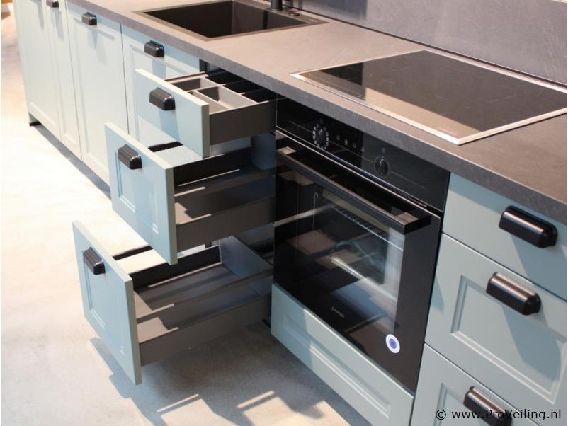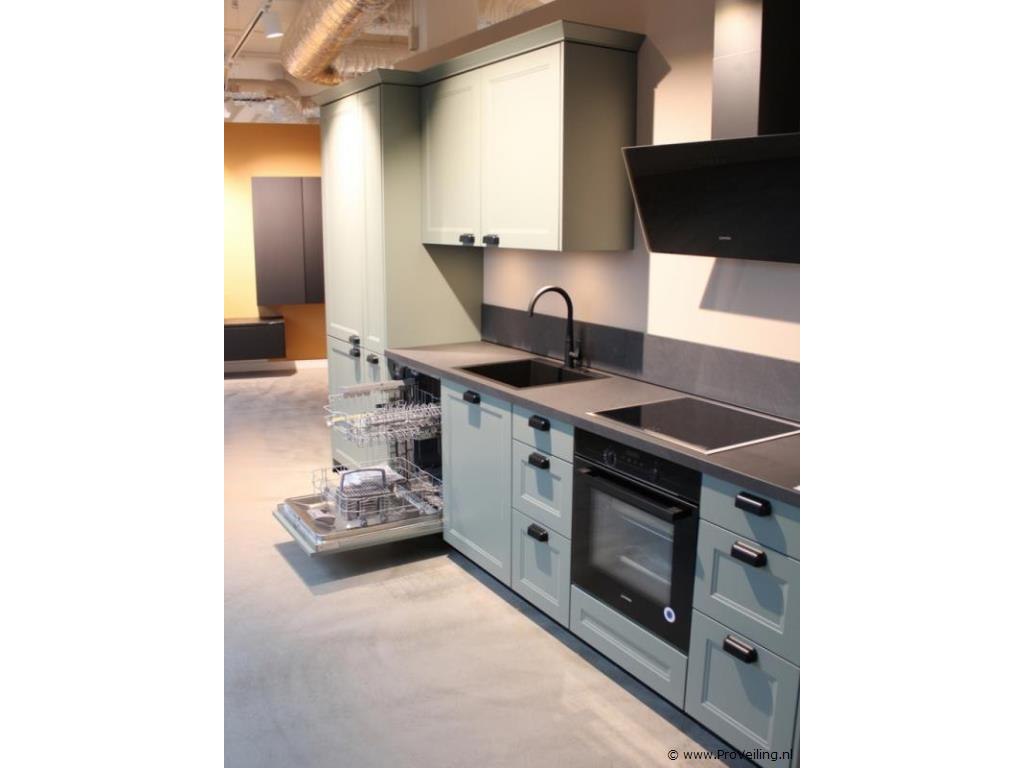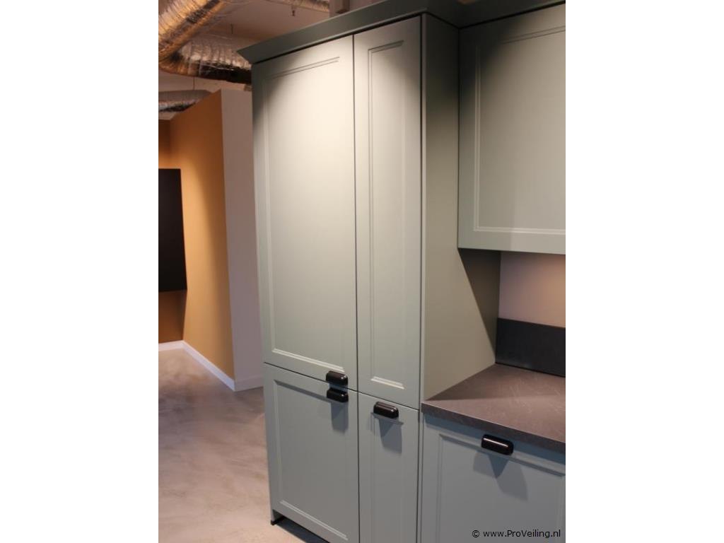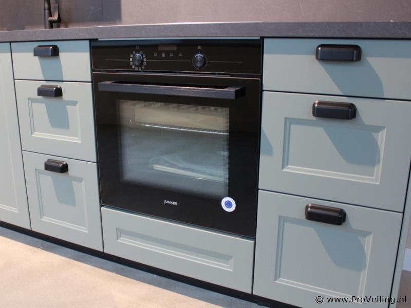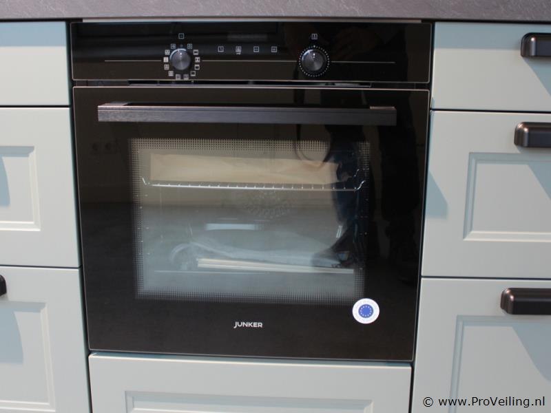Productnaam: Rechte keuken Frontkleur: Olijf groen mat Grepen: Metalen komgreep Afmeting: 356 cm breed - 226 cm hoog (excl. kroonlijst +/- 5 cm) Afmeting: Werkblad hoogte 93 cm Vaatwasser: Junker JB65X02HUE - Inbouwvaatwasser - Inhoud: 12–13 couverts - 6 programma's - Startuitstel: Ja (tot 24 u - Energiezuinig & stil (±50 dB) ( Junker is made by Bosch/Siemens) Kookplaat: Junker JF4677063 - Inductiekookplaat - 4 zones elk met booster - Bediening: TouchControl (centraal onderin) - RVS rand - kinderbeveiliging - restwarmte indicatie - timer ( Junker is made by Bosch/Siemens) Afzuigkap: Junker Schuine wandafzuigkap (hoofdvrij) - Touch-bediening (tiptoetsen op glas) - Verlichting: LED verlichting - Vetfilters: Aluminium cassette-filter (uitwasbaar) - Afzuigcapaciteit: ca. 500–750 m³/h* - heldere verlichting ( Junker is made by Bosch/Siemens) Oven: Junker Multifunctionele heteluchtoven met 10 programma's, o.a. grill, grill met hetelucht onder en bovenwarmte etc. kinderslot - timer ( Junker is made by Bosch/Siemens) Koelkast Junker Koel/vriescombinatie met elektronische bediening en digitale temperatuur aanduiding - 5 glazen plateaus waarvan 4 in hoogte verstelbaar - groentelade - vier sterren diepvries, 2 laden ( Junker is made by Bosch/Siemens) Werkblad: Kunststof werkblad met stootvaste abs wekbladrand - kleur grijs gemêleerd - smetplint 20 cm hoog op achterwand (twee-delig) Spoelbak: Zwarte strakke vierkante spoelbak voorzien van waste (water afvoer open en dicht met knop) - met kraanplateau Kranen: Gessi één hendel design keukenmengkraan - hoog boogmodel (past emmer onder) - kleur zwart Conditie: Showmodel Bijzonderheden: U dient dit meubel zelf te demonteren - Zonder afgebeelde accessoires / materialen (Diversen) op en in het meubel Ter waarde van: € 15225 Productbeschrijving: Complete showroomkeuken uitgevoerd in een tijdloos klassiek-modern design, voorzien van hoogwaardige inbouwapparatuur van Junker. De keuken is uitgerust met een werkblad met bijpassende achterwand, luxe spoelbak en moderne zwarte mengkraan. De opstelling beschikt over ruime onder- en bovenkasten, praktische lade-indelingen, een hoge apothekerskast met 6 voorraadmanden in hoogte verstelbaar en een volledig geïntegreerde koel-vriescombinatie. Verder voorzien van inductiekookplaat, inbouwoven, vaatwasser en een schuine design afzuigkap in zwart glas. Een complete, luxe keukenopstelling Demontage 1: U dient deze kavel zelf te demonteren in overleg - keuken bevind zich op etage, goederenlift is aanwezig Demontage 2: Demontage en bezorging van deze keuken is mogelijk. Neemt u contact op met onze Servicedesk via: info@proveiling.nl voor meer informatie. Conditie: Showroommodel Garantie: Wettelijke fabrieksgarantie.