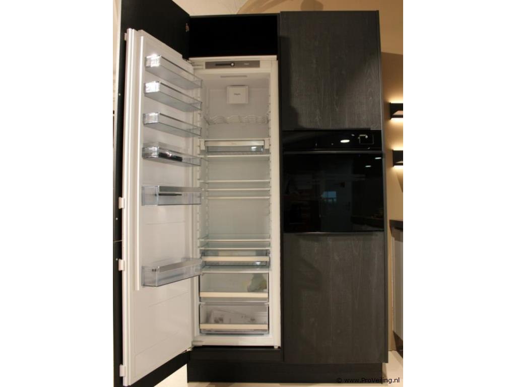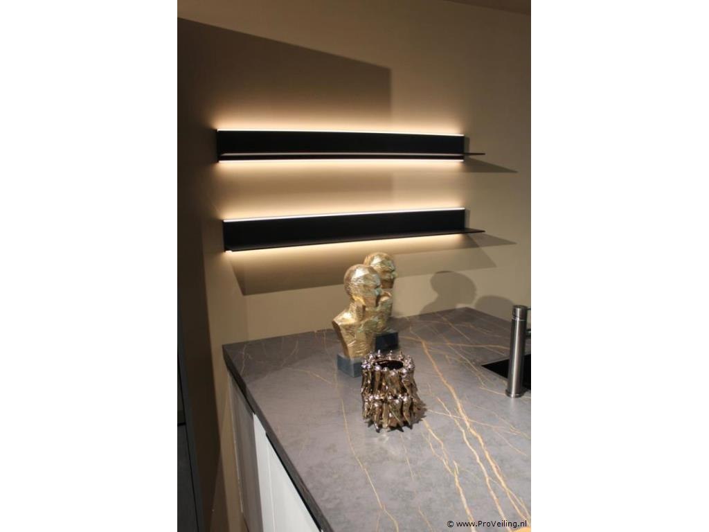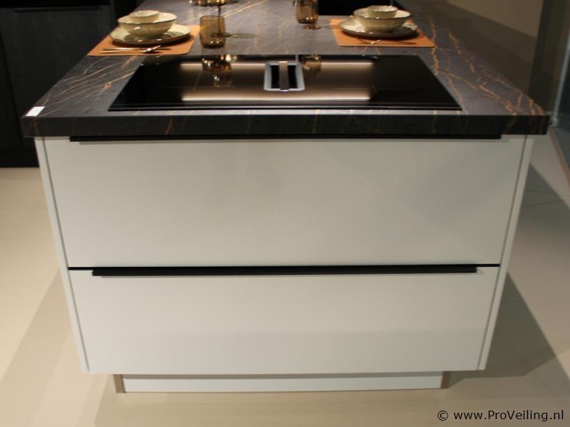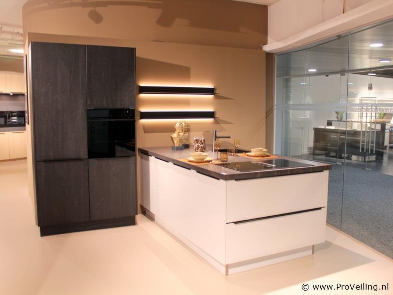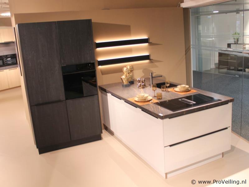 Merk: Brigitte Productnaam: Eilandkeuken met apparatenwand Model: Oxford / Calas Frontkleur: Apparatenwand Sherwood Nero - Eiland zijdegrijs/wit mat Plintkleur: Apparatenwand Sherwood Nero - Eiland zijdegrijs/wit mat Grepen: Geïntegreerde zwarte greeplijsten Afmetingen ca.: Eiland 247 x 128 cm - werkbladhoogte 98 cm Afmetingen ca.: Apparatenwand 124 cm breed - 230 cm hoog Vaatwasser: Pelgrim GVWC290L - Aantal couverts 14 - 7 wasprogramma's - Waterverbruik 8,9 liter - Geluidsniveau 39 dB(A) - Uitgestelde start 1-24 uur - vuilsensoren meten de vervuilingsgraad van het water en passen het wasprogramma daar automatisch op aan - ondersteuning, inspiratie en besturing via app (Wifi) - Deur opent automatisch voor extra droogresultaat Kookplaat: Pelgrim IKR9093ANT - Inductiekookplaat met afzuiging - 86 cm breed, A+ - met sierlijst - 4 kookzones (2 flexzones) - Deze luxe kookplaat beschikt over heldere LED verlichting - 10 standen per kookzone - boostfunctie per kookzone - Bediening LightOnly slider (wit led) - Timer(s) 4 timers met uitschakelfunctie - FlexCooking - Pauzefunctie - automatische opwarmfunctie - Warmhouden Afzuigkap: Pelgrim IKR9093ANT - geïntegreerd in kooplaat - Afzuigcapaciteit: Luchtafvoer afzuigcapaciteit (min/max/int): 220 / 450 / 620 m³/h - Geschikt voor afvoer naar buiten en recirculatie - 10 afzuigsnelheden - 1 x meerlaags vetfilter, geïntegreerd in afzuigunit - Intensiefstand - Naloopstand - AutoAir: Ja, afzuiging past zich automatisch aan op inductie stand Oven 1: Pelgrim OVS860 - Multifunctionele hetelucht / Stoomoven - 26 ovenfuncties o.a. Boven- en onderwarmte, Deeg rijzen, Eco Turbo-hetelucht, Grote grill, Ontdooien, Pizza -73 automatische bakprogramma’s - TFT display - volledige zwart glas design - Externe stoomgenerator met waterreservoir van 1,2 liter Koelkast Pelgrim PKD25178 - Koelkast (178 cm) - totaal inhoud koelgedeelte 301 liter - deur-op-deur montage met soft-close - heldere LED binnenverlichting, LED indicatiemeter, snel koelen functie, 7 draagplateaus, 6 deurbakken, 3 groentelades, flessenrek, alarmsignaal bij open deur en hoge temperatuur Werkblad: Keramisch werkblad - kleur donker marmerlook met goudkleurige adering - rechte facet geslepen werkbladrand Spoelbak: Strakke vierkante RVS spoelbak met kleine hoekradius - vlakingebouwd Kraan: Lanesto Eén-hendel design keukenmengkraan - kleur wit - Haaks model Conditie: Demomodel Bijzonderheden: U dient dit meubel zelf te demonteren - Zonder afgebeelde accessoires / materialen (Diversen) op en in het meubel Ter waarde van: € 36150 Productbeschrijving: Stijlvolle moderne keuken met wit uitgevoerde onderkasten en donker houtlook hoge kasten. Het royale kookeiland is voorzien van een donker marmerlook werkblad met goudkleurige adering, een inductiekookplaat met geïntegreerde afzuiging en een spoelgedeelte met vlak ingebouwde RVS spoelbak. De keuken beschikt over ruime opbergmogelijkheden, soft-close laden en geïntegreerde verlichting en is uitgevoerd als complete showroomopstelling. Demontage 1: U dient deze kavel zelf te demonteren in overleg - keuken bevind zich op etage, goederenlift is aanwezig Demontage 2: Demontage en bezorging van deze keuken is mogelijk. Neemt u contact op met onze Servicedesk via: info@proveiling.nl voor meer informatie. Conditie: Showroommodel Garantie: Wettelijke fabrieksgarantie.