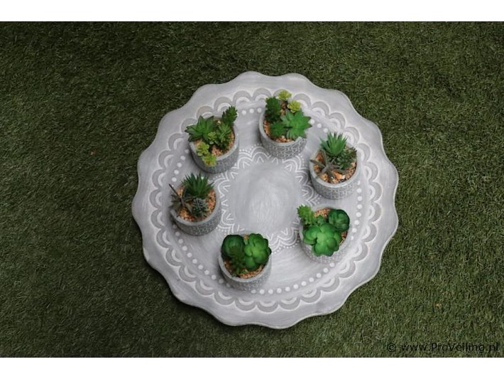 ; schaal met kunstplantjes in pot; afmeting schaal ca. Ø 44cm; zie afbeeldingen.
