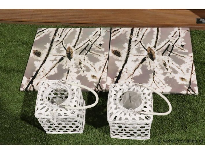 Canvas schilderijen; afmetingen ca. 50x50cm; aantal 2 stuks; incl. Countryfield windlichten; afmetingen ca. 20x20x27cm; aantal 2 stuks; zie afbeeldingen.