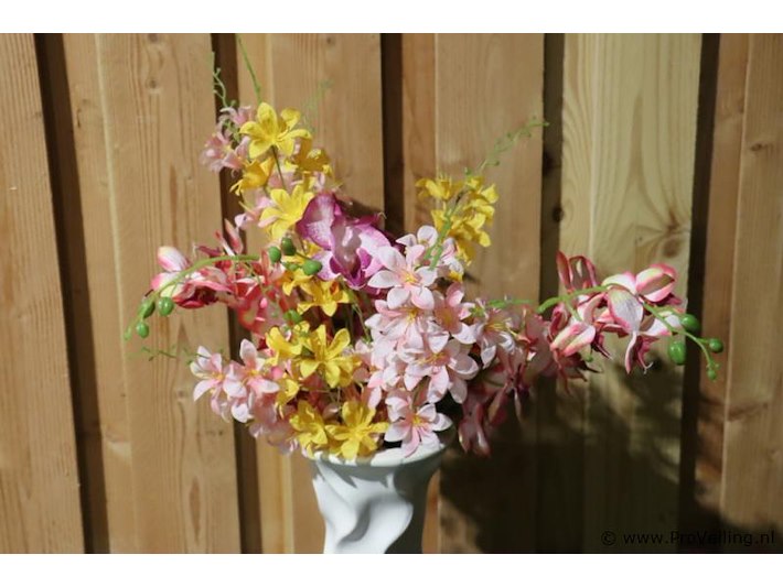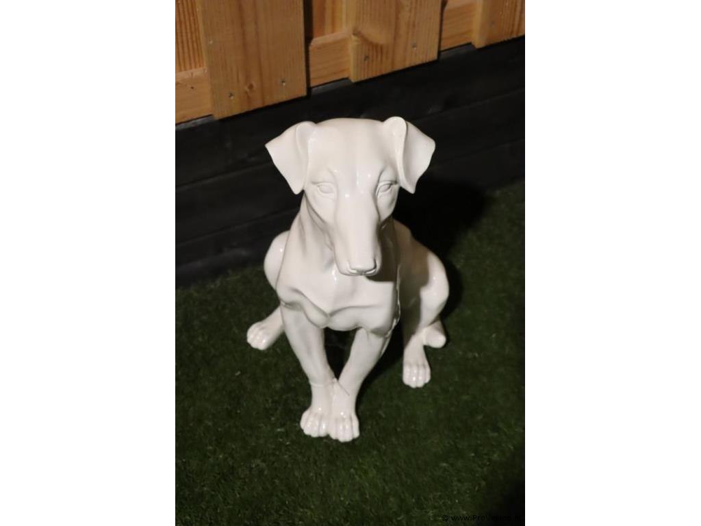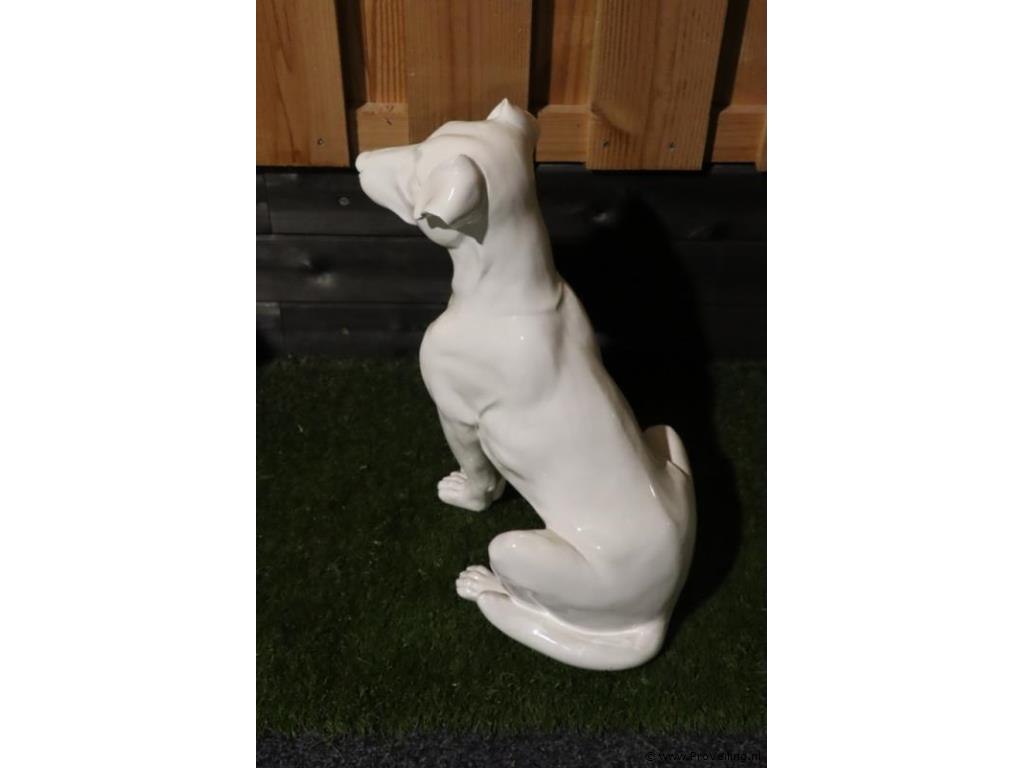 Decoratief kunststof beeld van een hond; afmetingen ca. 44x30x56cm; incl. stenen vaas met kunstbloemen; afmetingen ca. Ø 18cm x 77cm (h); zie afbeeldingen.