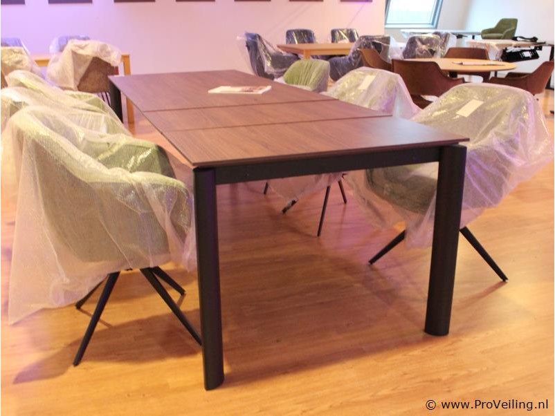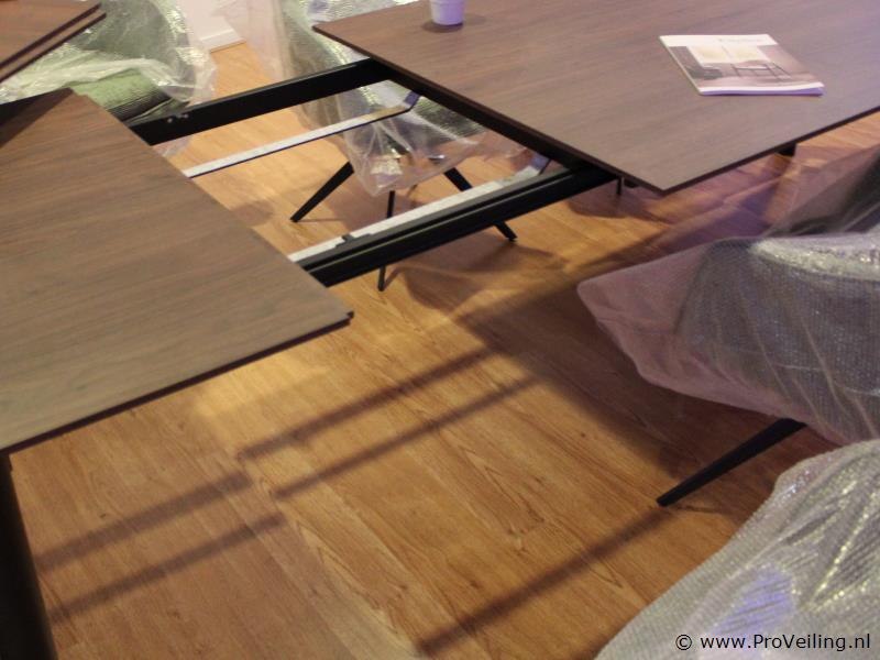 Merk: Nobilia Productnaam: Eetkamertafel Conditie: Showroommodel Ter waarde van: € 1899 Productbeschrijving: Eettafel Nobilia – notenkleur met zwart onderstel Moderne eettafel van Nobilia, uitgevoerd met een rechthoekig tafelblad in notenhoutkleur en een strak zwart metalen onderstel. De tafel is voorzien van een uitschuifbaar systeem met losse verlengbladen, waardoor het tafeloppervlak eenvoudig kan worden vergroot. Ideaal voor zowel dagelijks gebruik als grotere gezelschappen. Kenmerken – Rechthoekig tafelblad in notenkleur – Strak en modern design – Zwart metalen onderstel met stevige ronde poten – Uitschuifbaar met losse verlengbladen – Stabiele en solide constructie – Geschikt voor eetkamer of vergaderruimte Productinformatie – Merk: Nobilia – Type: eettafel / uitschuiftafel – Kleur blad: notenlook – Onderstel: zwart metaal – Vorm: rechthoekig – Conditie: showroommodel / zeer nette staat Maatvoering (ingeschat) – Lengte (ingeschoven): ca. 200 cm – Lengte (uitgeschoven): ca. 280–300 cm – Breedte: ca. 95–100 cm – Hoogte: ca. 75 cm Voordelen Uitschuifbaar voor extra zitplaatsen – Tijdloze notenlook – Sterk metalen onderstel – Geschikt voor grote gezelschappen – Veelzijdig inzetbaar