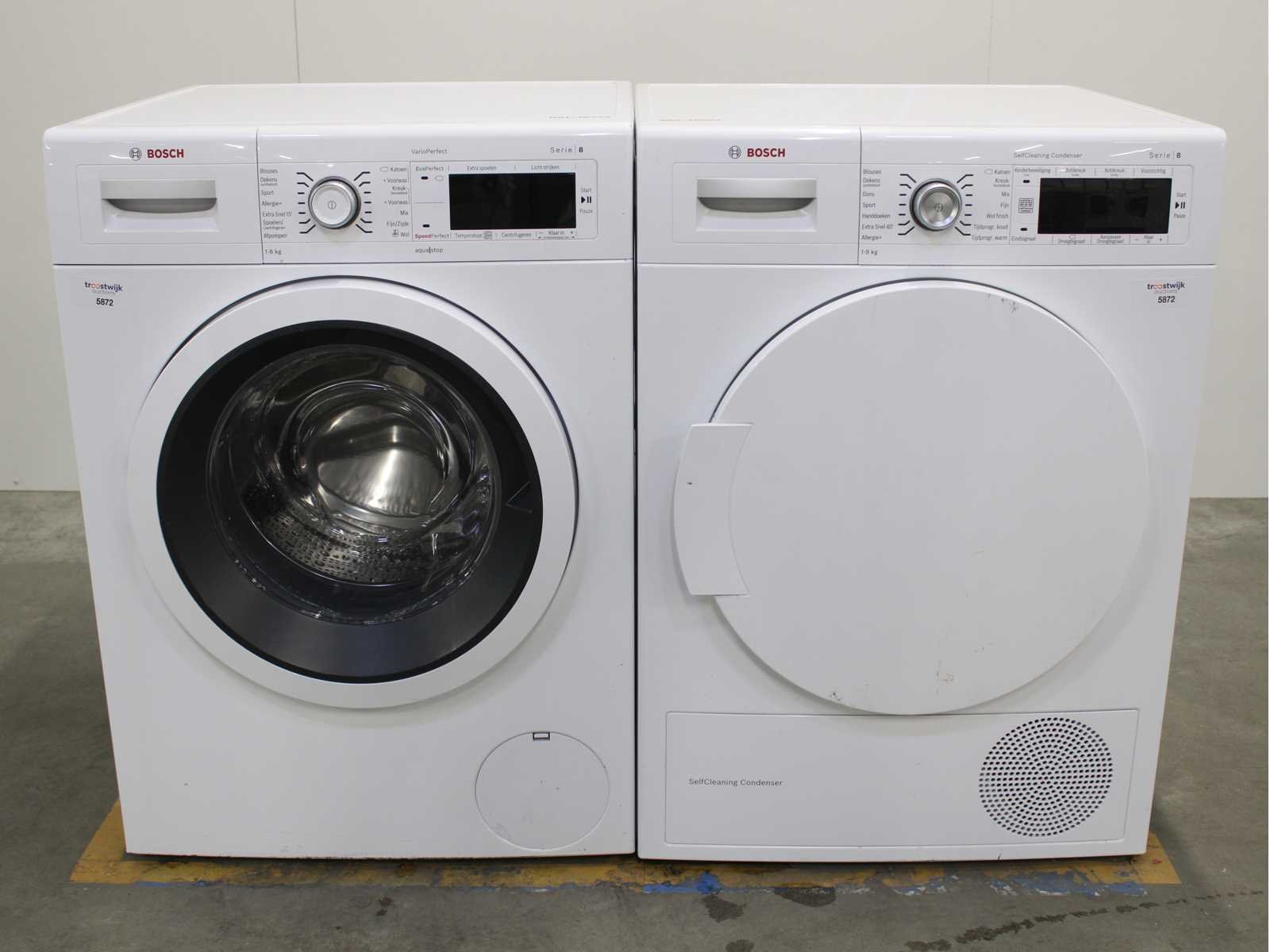 Deze wasmachine en wasdroger komen uit een partij jong gebruikt A-Merk witgoed. De machines zijn volledig getest, gereinigd en indien nodig gerepareerd. Houdt er rekening mee dat de machines lichte gebruikssporen kunnen hebben. Wasmachines en wasdrogers hebben vaak standaard afmetingen. Hoogte 85cm, Breedte 60cm en Diepte 60 tot 70cm, incl. uitstekende slangen e.d. aan de achterzijde. Als de machine vrij komt te staan is de afmeting minder relevant. Wil je de machine in een nis plaatsen of inbouwen? Controleer dan de exacte afmetingen op basis van het aangeboden merk en model/type. Within 7 days Merk: Bosch Serienummer: WAW32461NL/14 en WTW84562NL/03