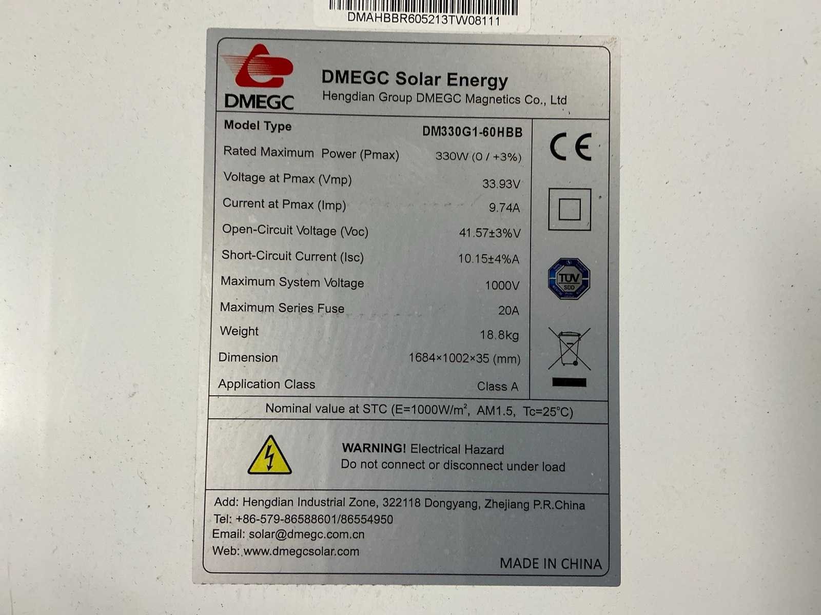 Gebruikt, 19x 330W, Op en inclusief pallet Merk: DMEGC Type: DM330G1-60HBB Eigen gewicht: 19kg Totale afmeting L: 1684mm Totale afmeting Breedte: 1002mm Totale afmeting Hoogte: 35mm