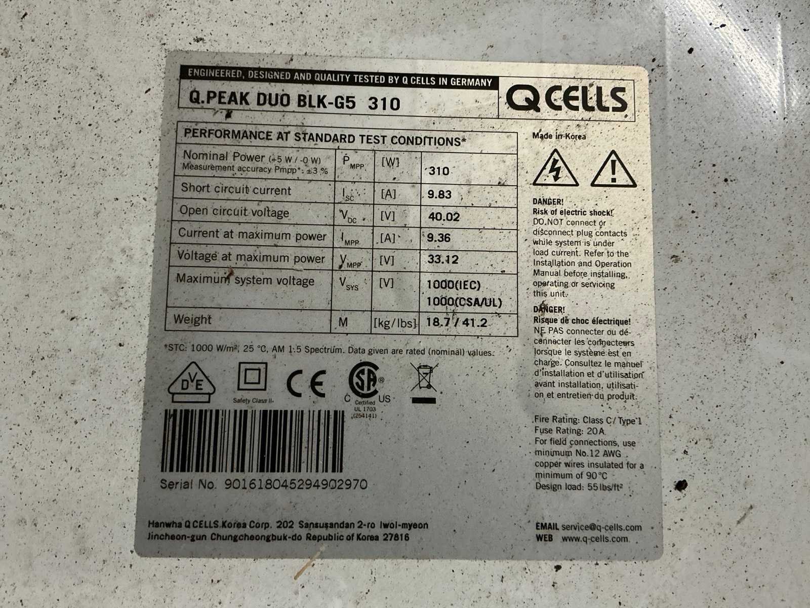 Gebruikt, 6x 310W, Op en inclusief pallet Merk: QCells Type: Q PEAK DUO BLK-G5 310 Eigen gewicht: 18kg Totale afmeting L: 1680mm Totale afmeting Breedte: 995mm Totale afmeting Hoogte: 30mm