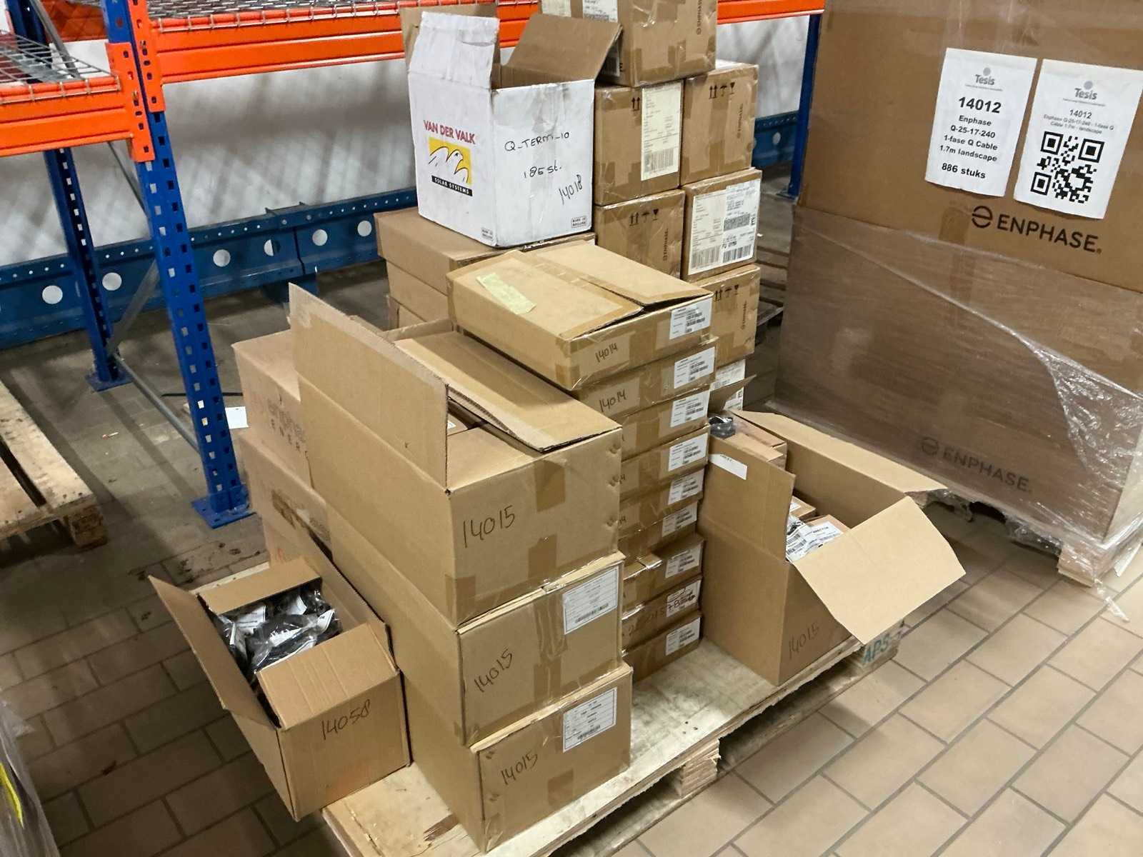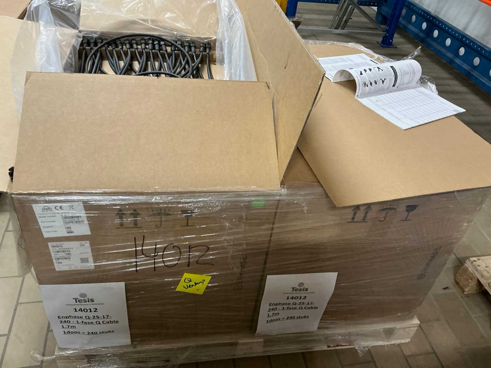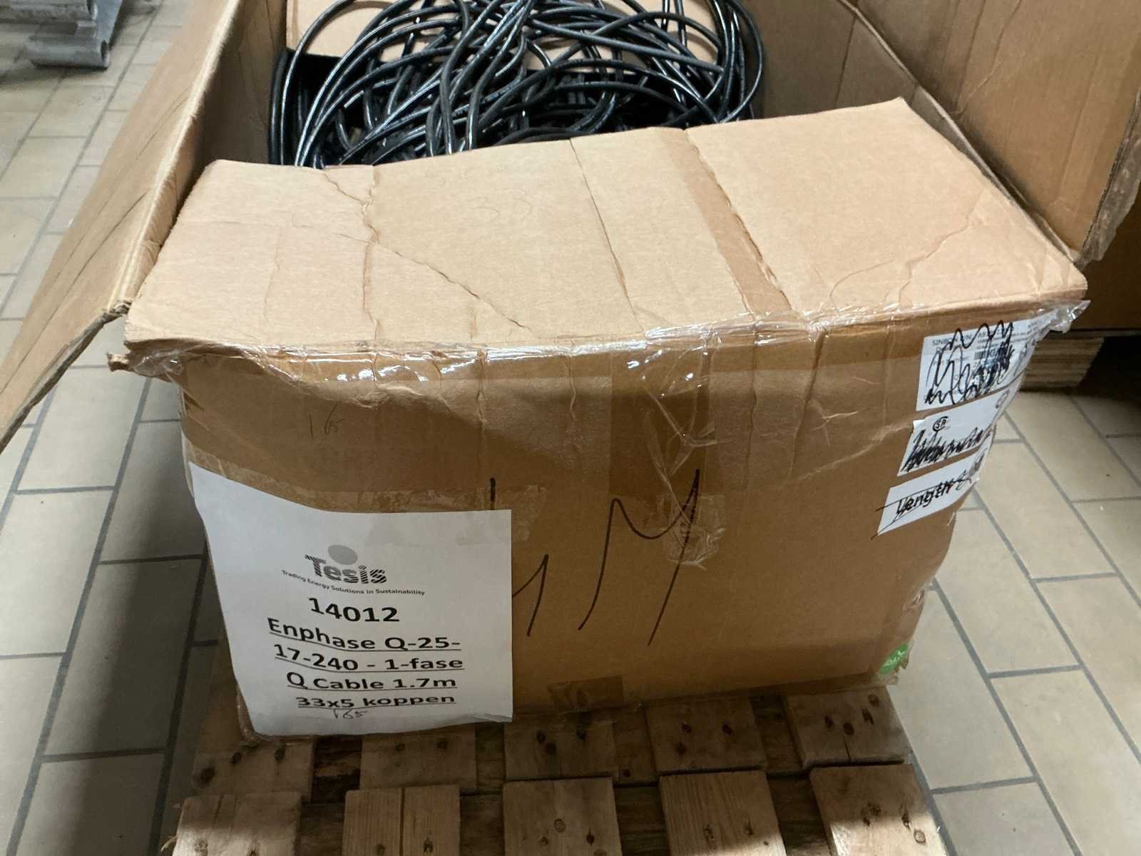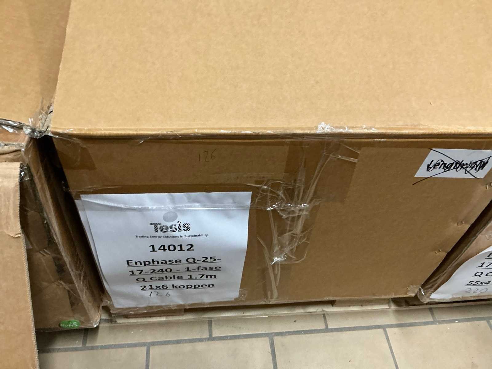 Totale kavel bestaat uit 7 pallets met ca 2000 stuks kabel en installatie materiaal, waaronder: ENPHASE Q-25-10 240 1-fase 1 meter, ENPHASE Q-25-17 240 1-fase 1.7 meter, PV- connector (Q-seal-10), Q-cable afsluitdop, Q-cable einddop, Connector clips. Merk: ENPHASE Q-25 Type: Zonnepaneel