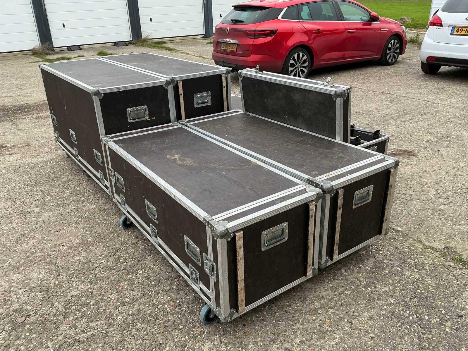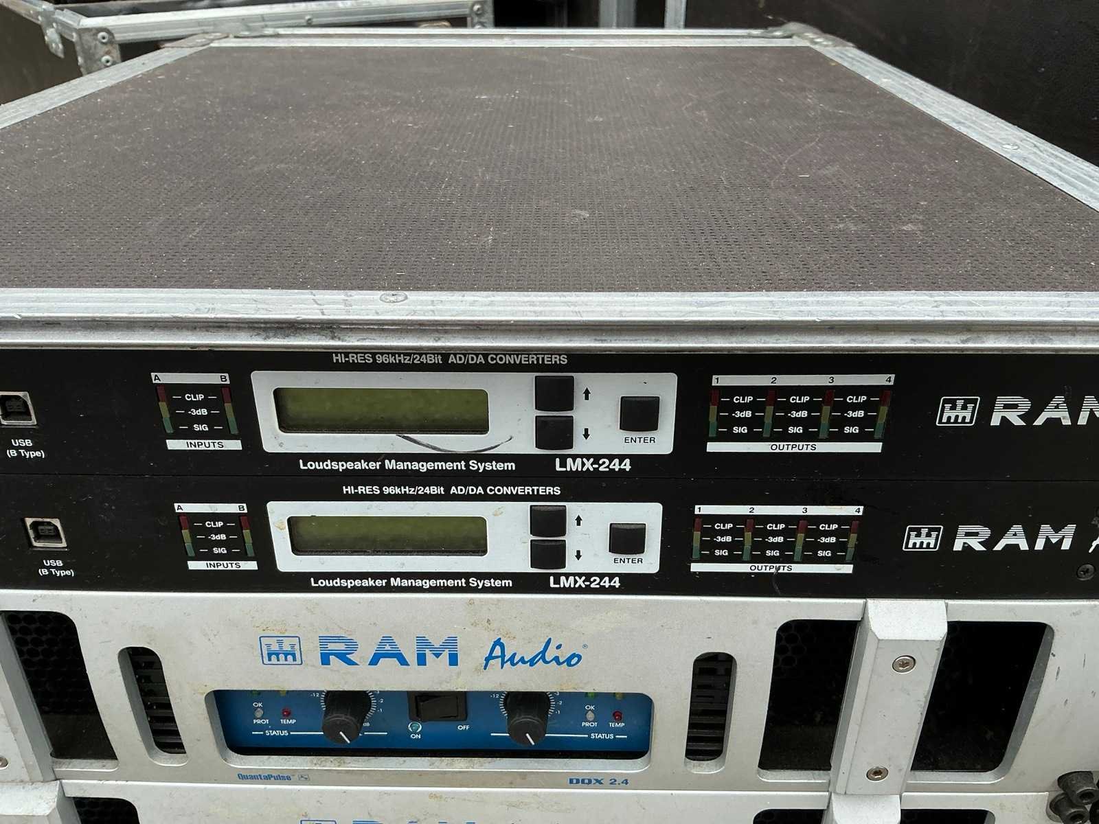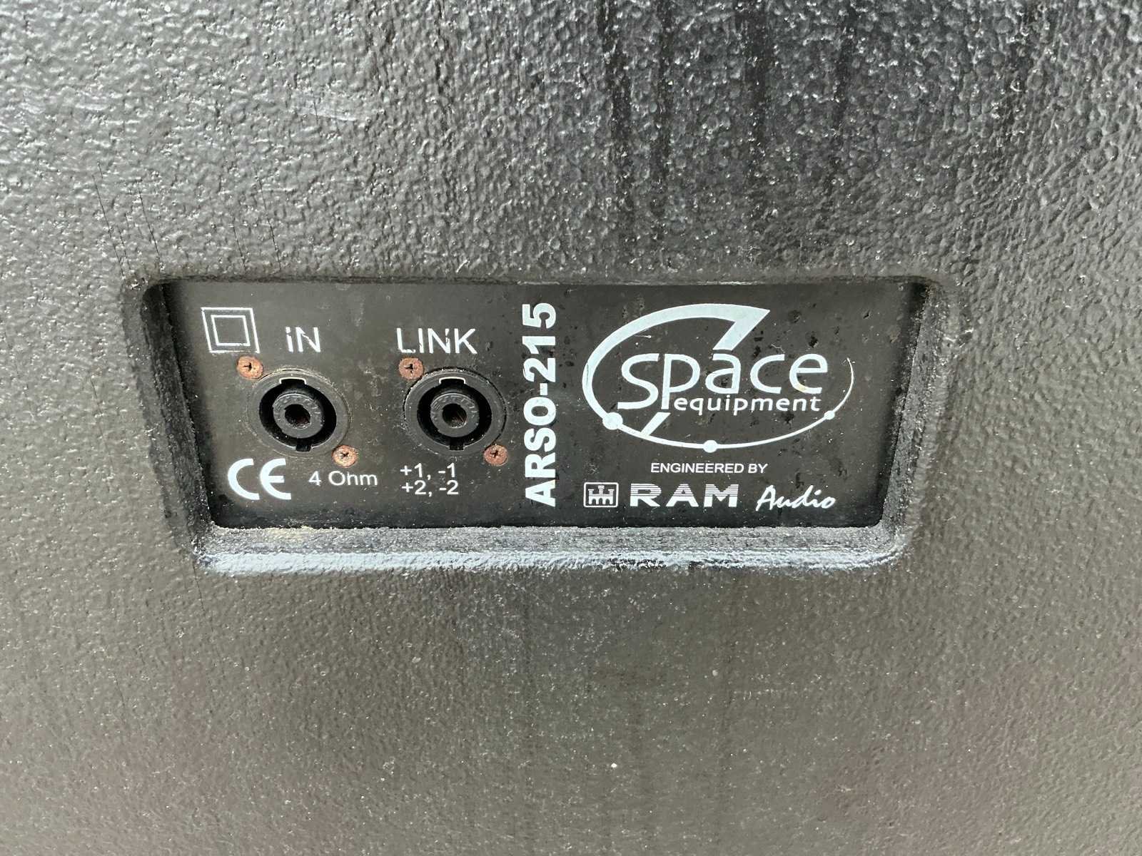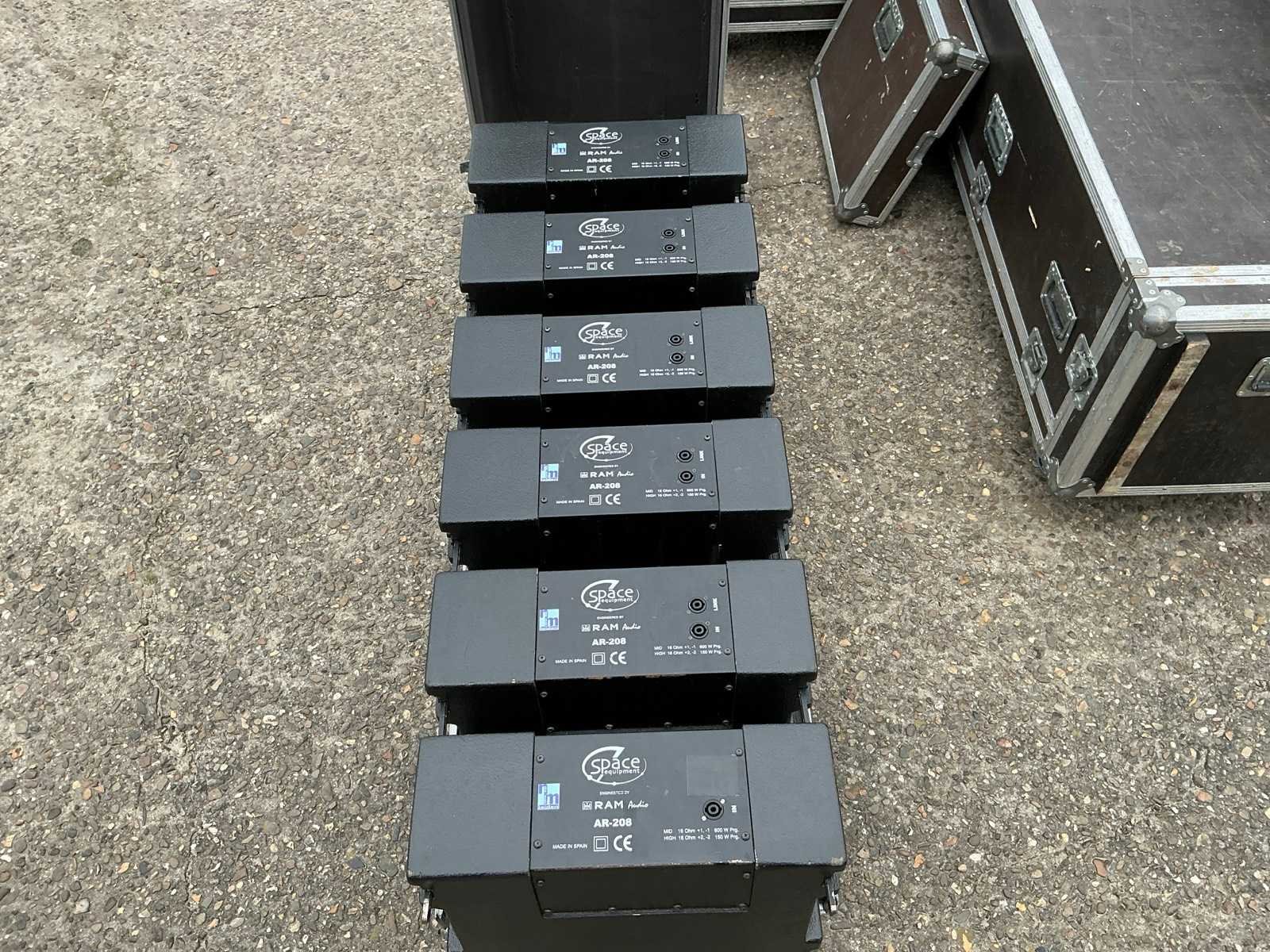 Set bestaat in totaal uit 6 flightcases. 12x 8” top AR208, 4x sub Arso 215, versterkerrack met Ram audio LMX-244 loudspeaker management system en 3x RAm Audio versterker ( DQX 2.4,4.0 en 5.5) Merk: Space Equipment