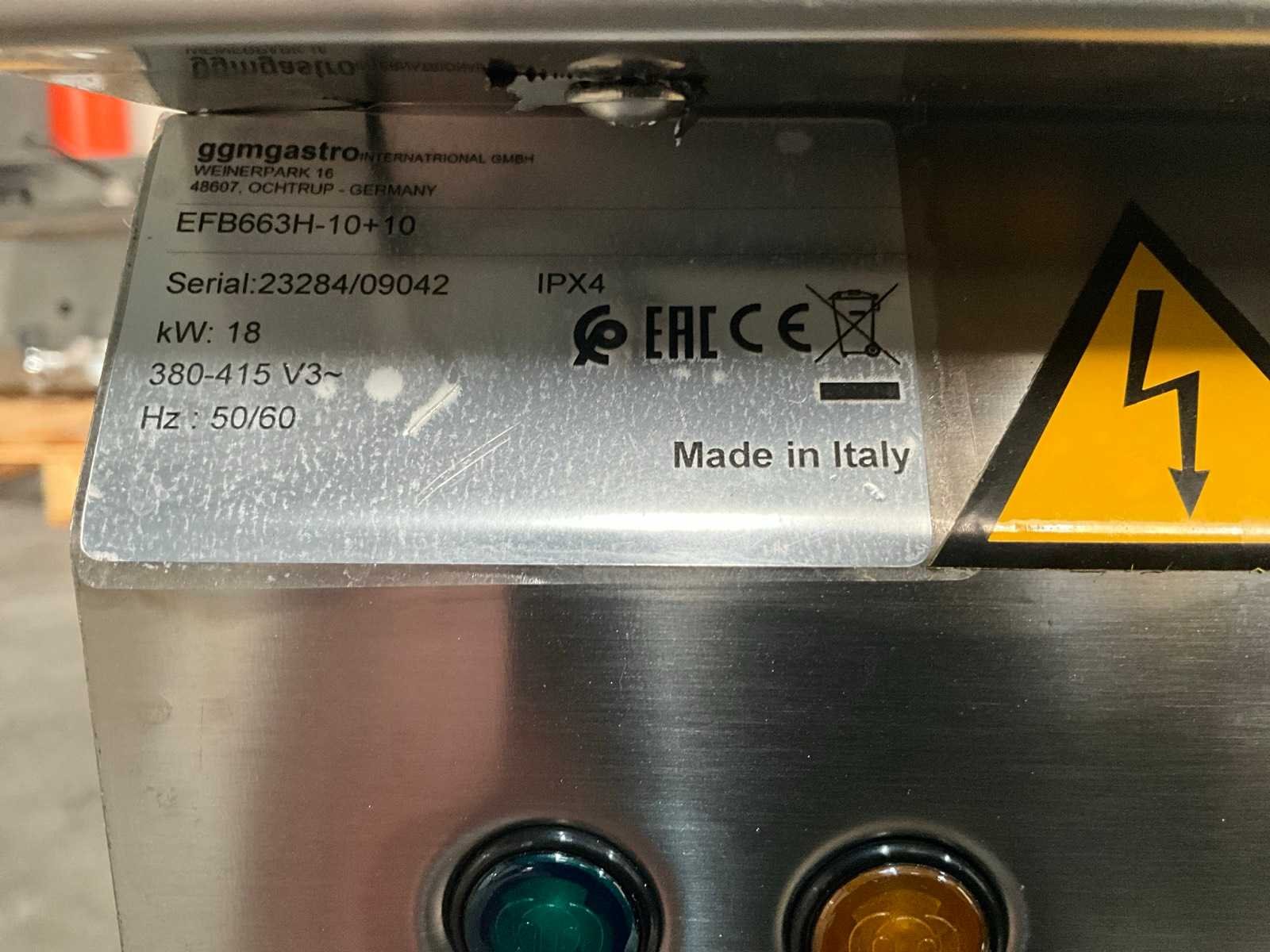 Merk: ggmgastro Model: EFB663H-10+10 Lengte: 73cm Breedte: 60cm Hoogte: 41cm Materiaal: RVS Aantal zones: 2 Vermogen (kW): 18 Elektrisch: true Spanning: 380