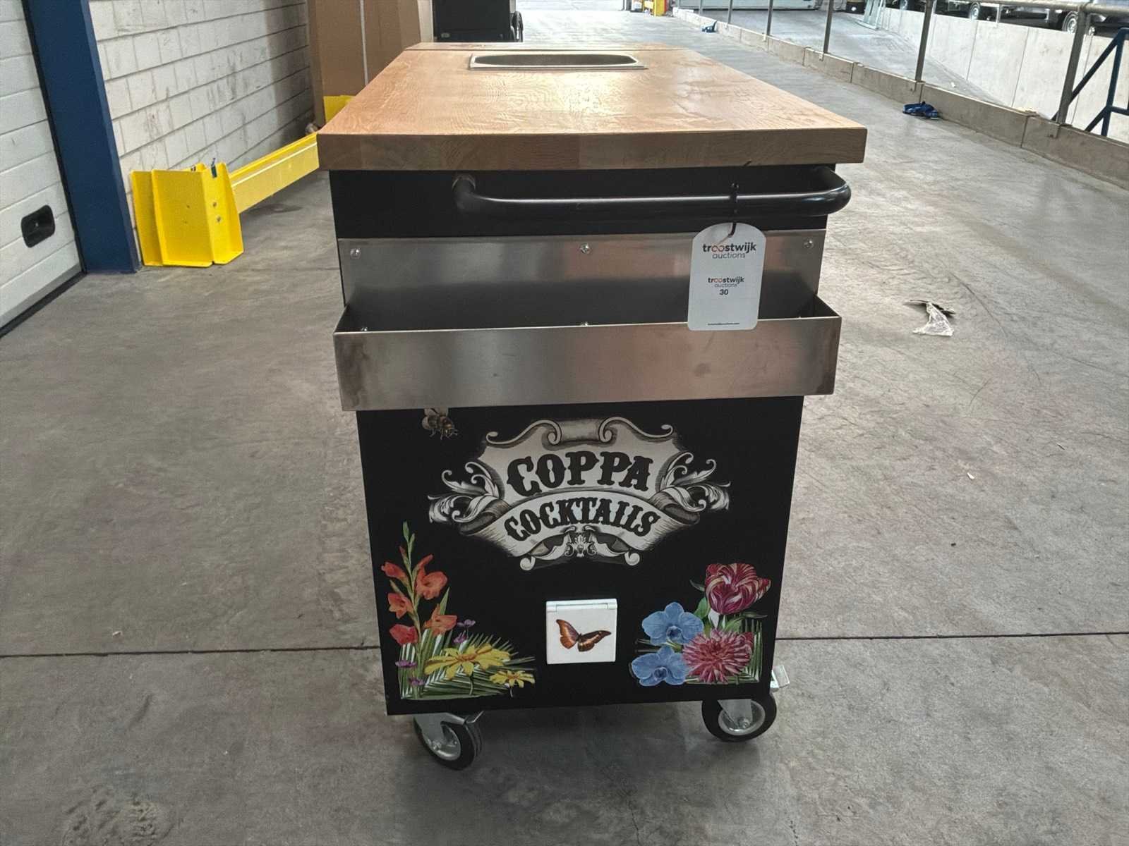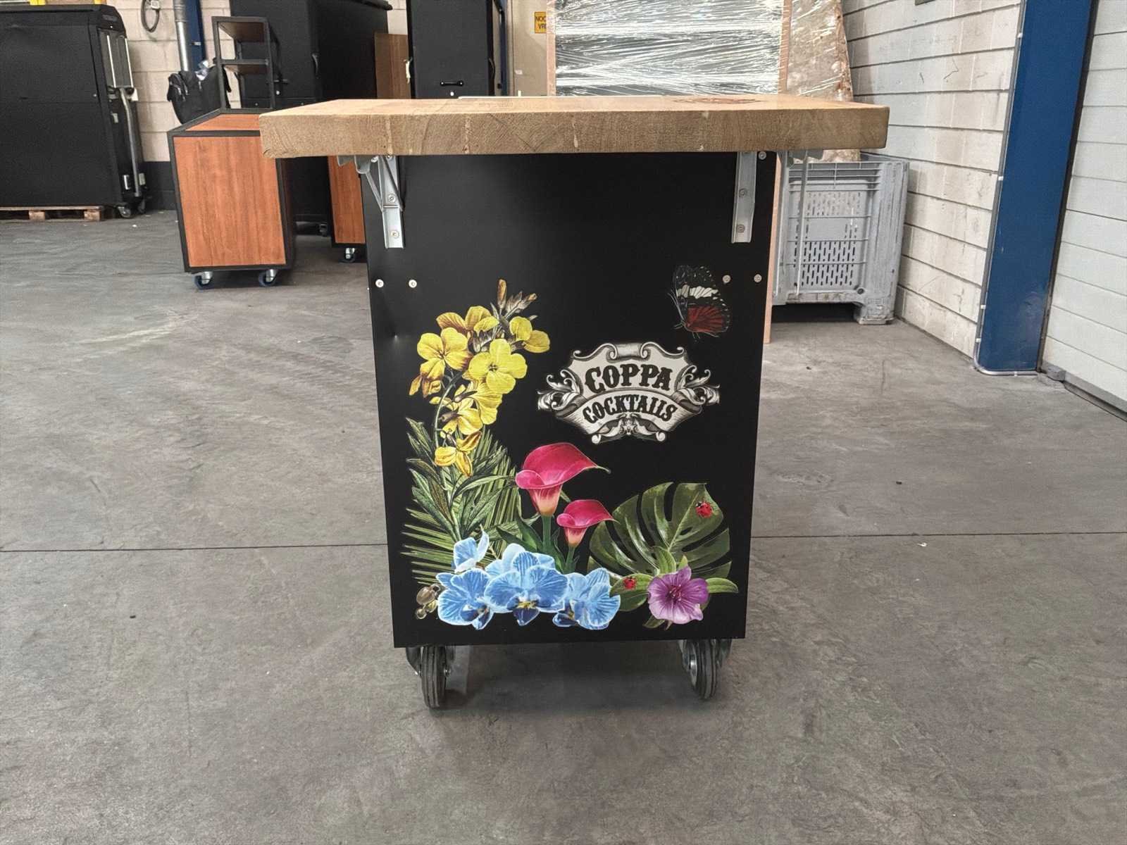 Voorzien van: 4 wielen waaronder 2 zwenkwieken met rem, 1x wasbak, 1x opbergkast! 1X RVS flessenhouder, 1x sidetable, 1x stroomaansluiting Totale afmeting L: 62cm Totale afmeting Breedte: 167cm Totale afmeting Hoogte: 104cm Hout: true Metaal: true