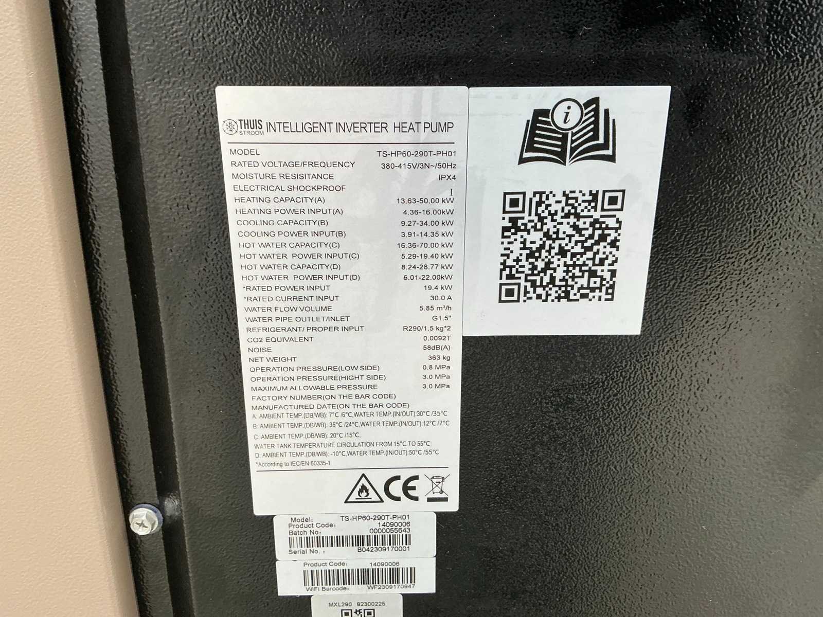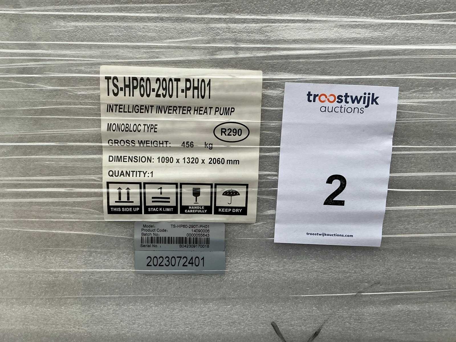 Koelmiddel R290, heating capacity 50kw, 380-415v. Serienummer: B042309170018. Dit betreft een nieuw verpakte unit. Merk: Thuisstroom/Wattson Power Model: TS-HP60-290T-PH01 Lengte: 109cm Breedte: 132cm Hoogte: 2060cm