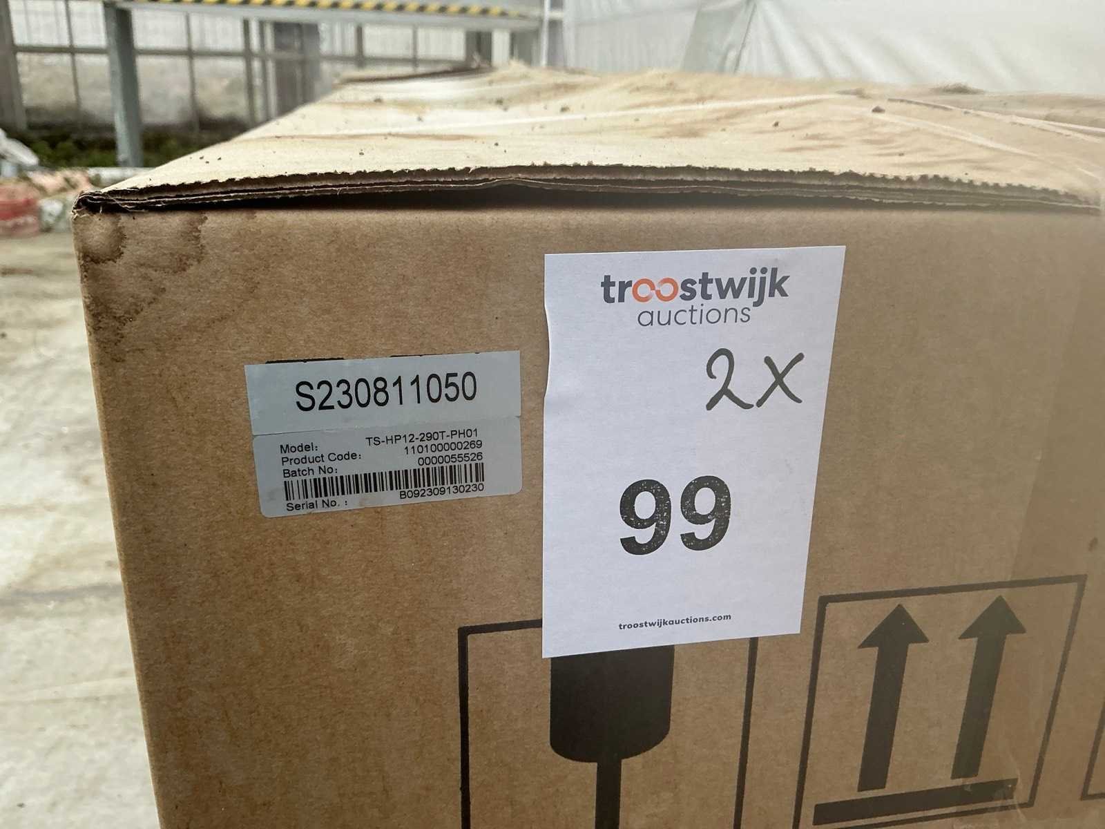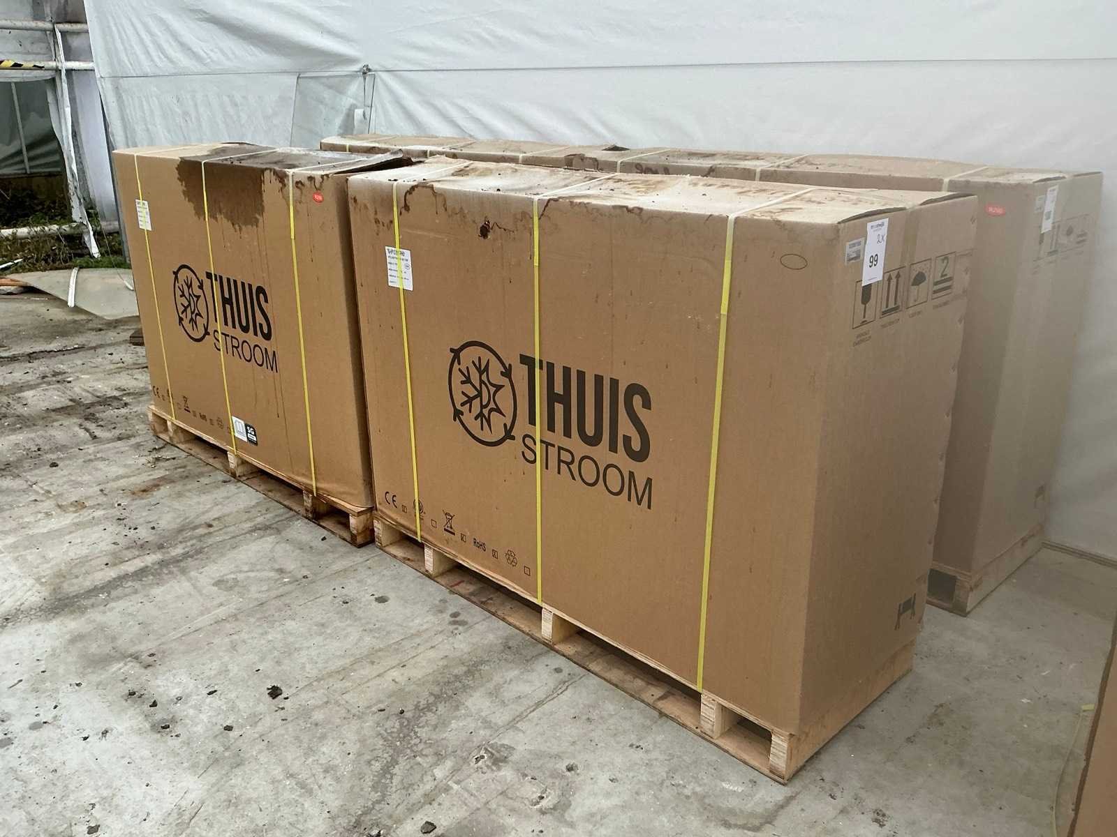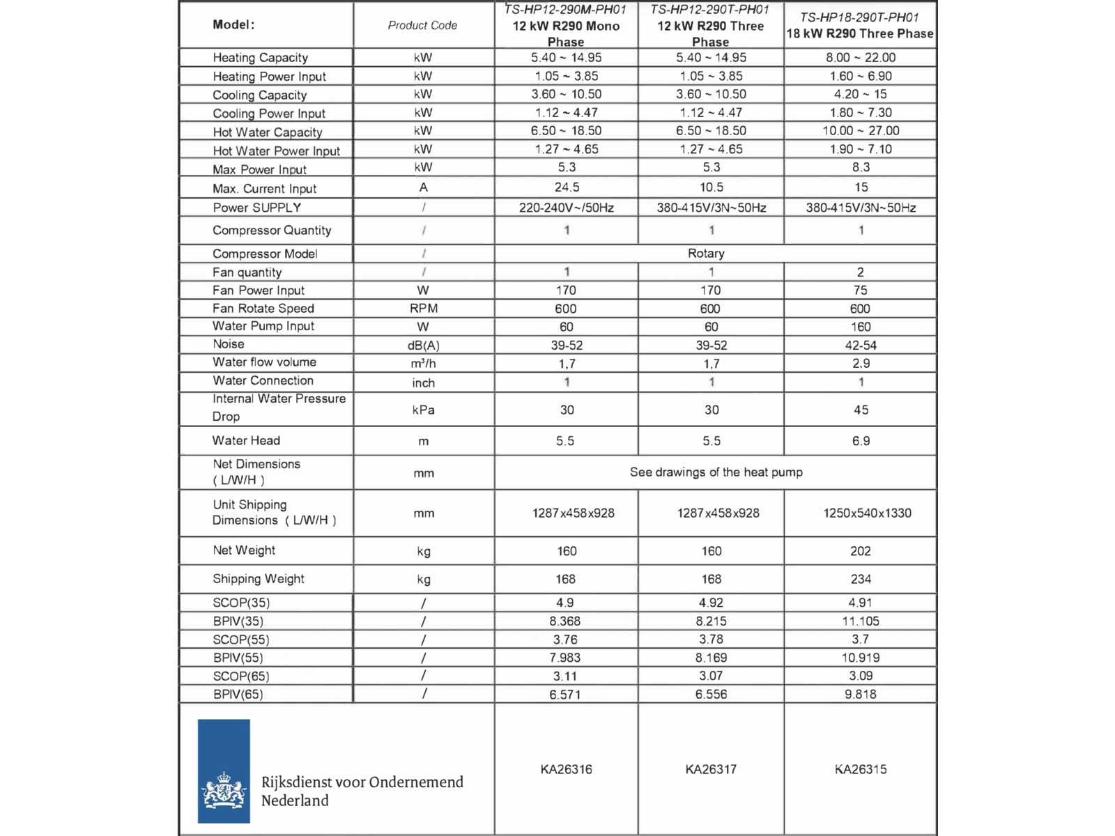 Serienummers: B092309130230 en B092309130175. Dit betreft verpakte units. R290 refrigerant gas Energy Class: A++++ Heating + Cooling + Hot Water Full DC inverter compressor and fan motor Max outlet temperature: 70 O Wifi smart control Inverter water pump inside Modbus RS485 Full DC Inverter Technology Merk: Thuisstroom Model: TS-HP12-290T-PH01 Kleur: Zwart Gewicht: 175kg Lengte: 141cm Breedte: 52cm Hoogte: 96cm Materiaal: Metaal