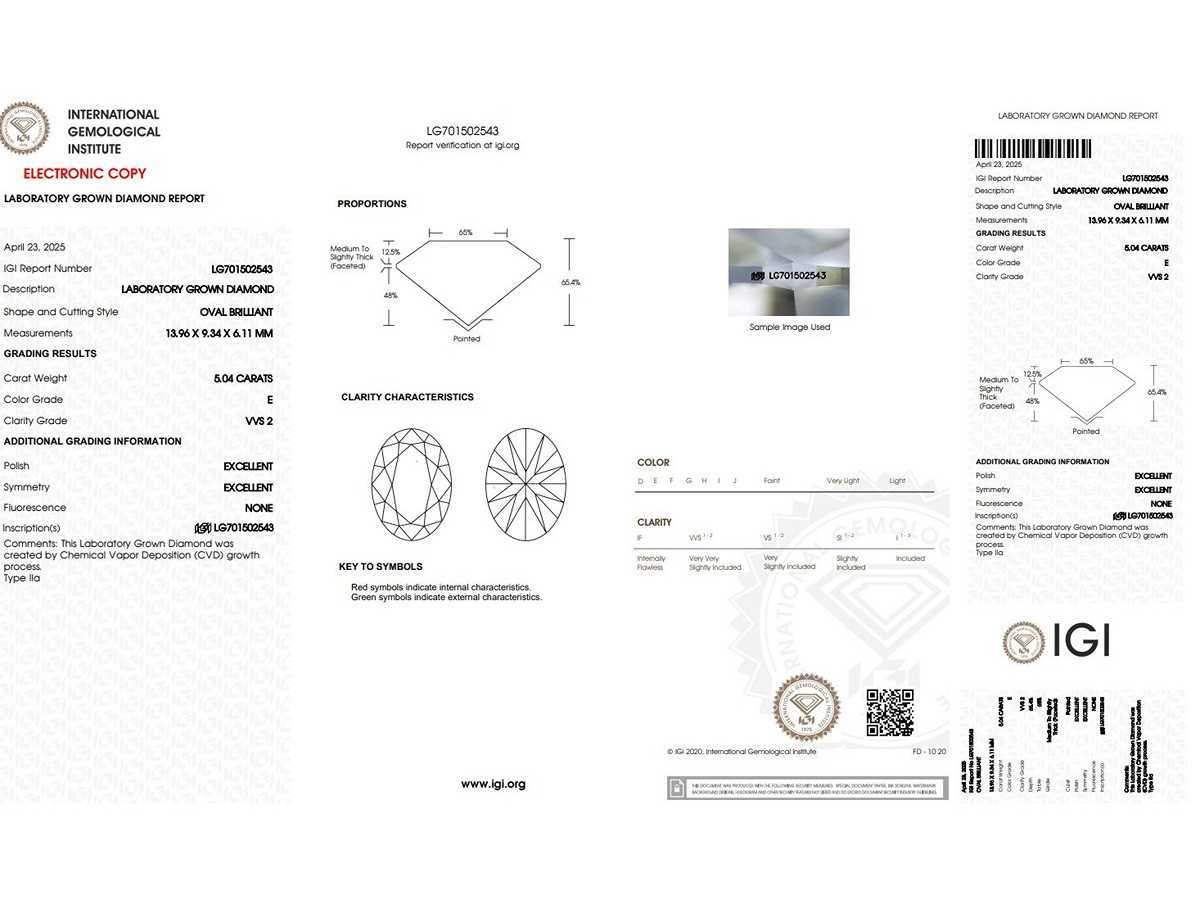 Exclusieve 18K witgouden ring Ringmaat - 54 EU / 14 IT / 6.75 US Rapportnummer IGI: LG701502543 Totaal karaatgewicht - 5,55 Ovale briljant Gewicht van de hoofdsteen: 5,04 CT Kleur: E Helderheid: VVS2 Snede: uitstekend Symmetrie: uitstekend Omringende stenen - 0,51 (30 stuks) Totale ringgewicht: 3,27 gram Bezichtiging op afspraak Materiaal: Witgoud Lage schatting: 9900€