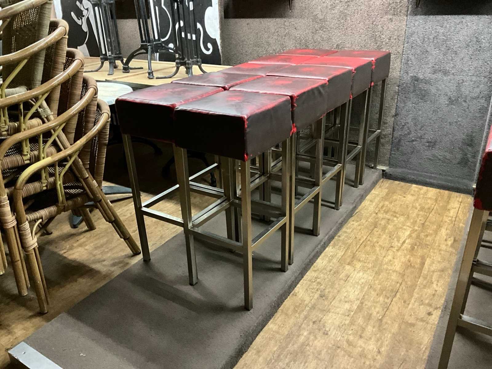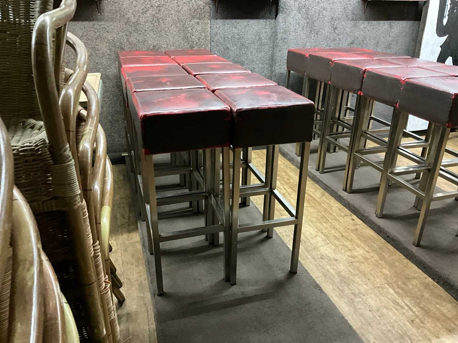 Roestvast staal onderstel; lederlook zitting; gebruiksporen;