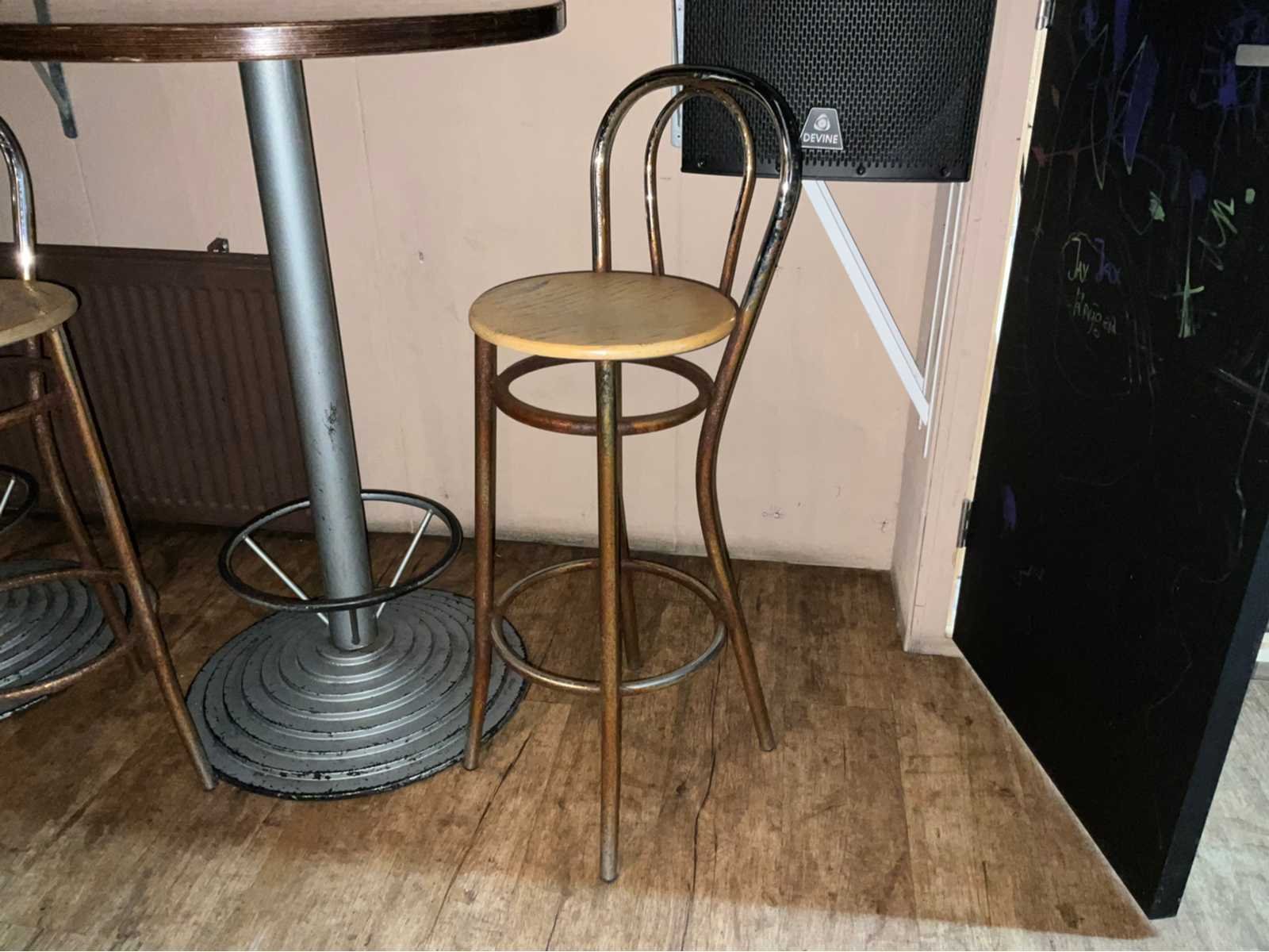 Waaronder 2x bartafel op centrale voet met voetsteun; zwaar rond hout tafelblad; 2x barkruk;