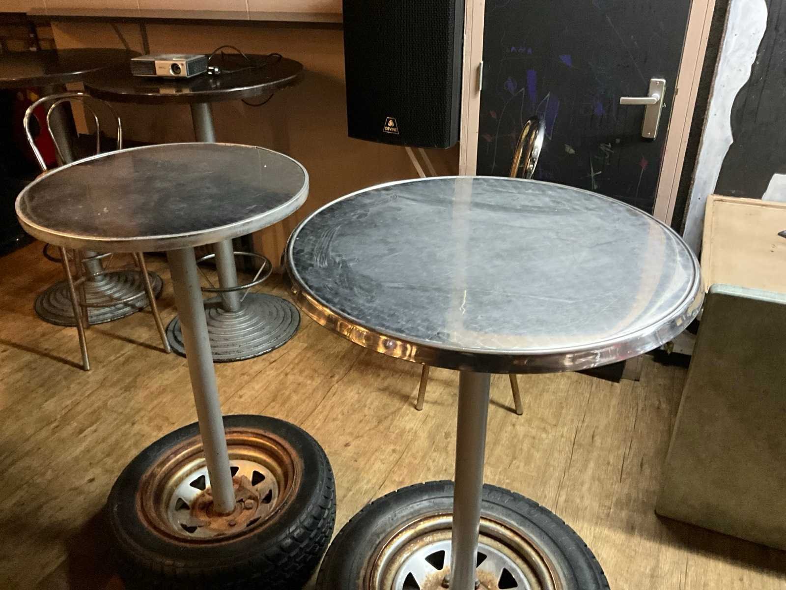 Op centrale voet voorzien autoband voet; roestvast staal rond tafelblad; diameter 600 en 700 mm;