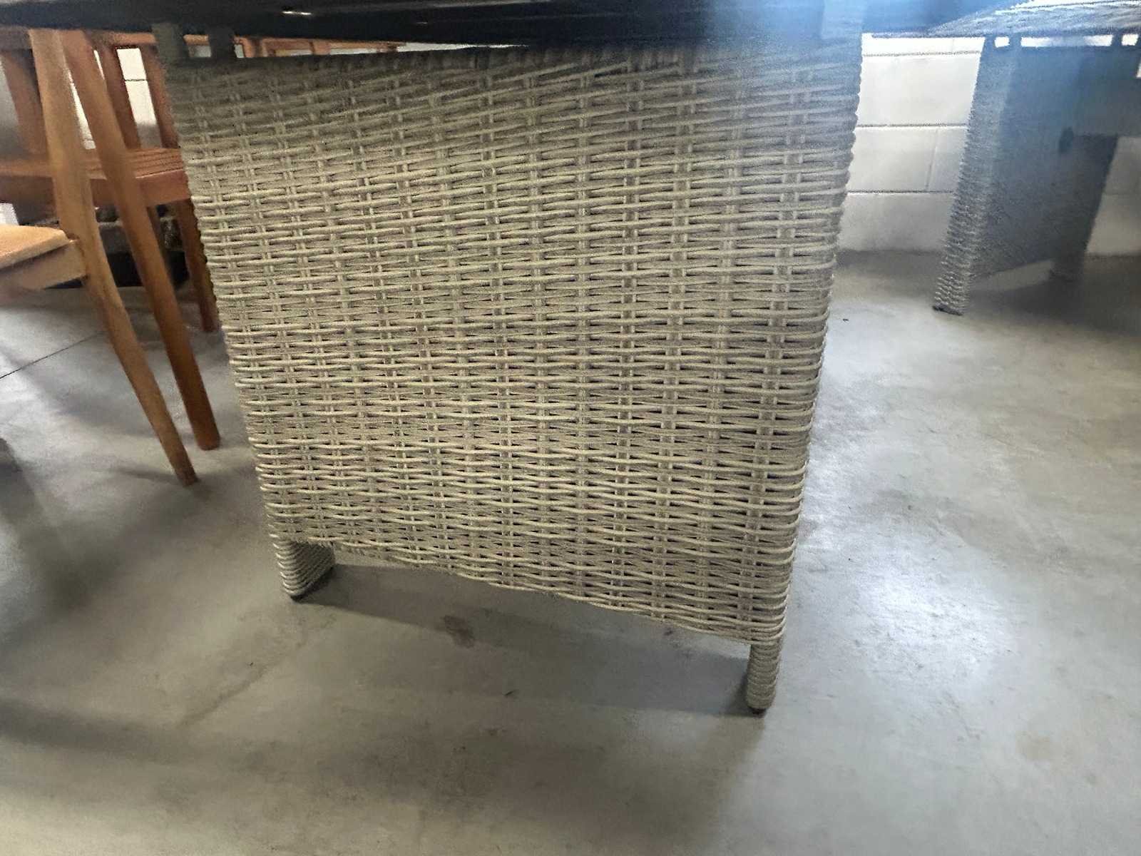 Materiaal blad: Veiligheidsglas met keramische laag Model: Dublin Vorm: rechthoekig Kleur: Grijs Lengte: 145cm Breedte: 85cm Hoogte: 70cm Materiaal: Halfrond wicker op aluminium frame